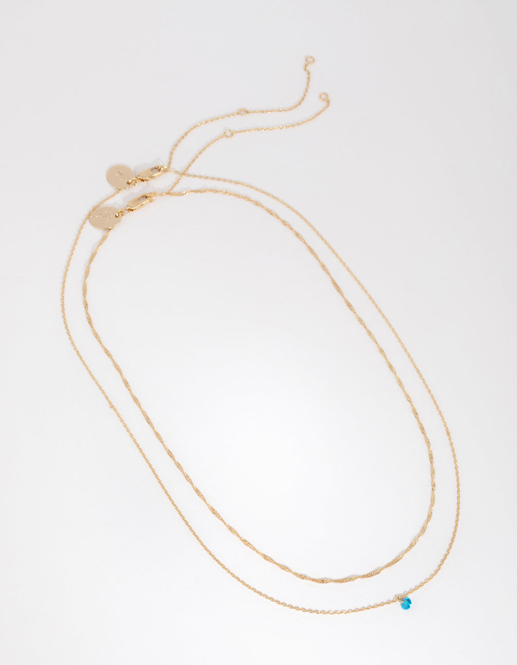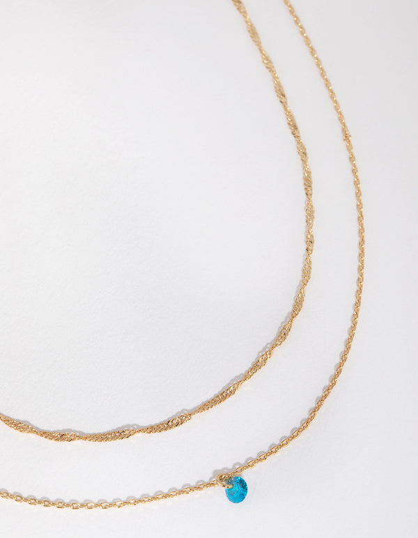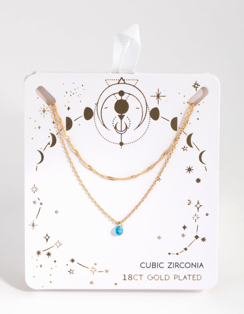 Be guided by the stars: a premium collection of thoughtful pieces that promote self-assurance and resilience through birthstones and the signs of the zodiac. This elegant necklace set is plated with genuine 18ct gold for authentic lustre and shine. It features two dainty chain necklaces. One boasts a Singapore chain and on the other a vivid blue cubic zirconia gently rests on a fine cable chain. Blue Topaz is the birthstone for the month of December, and it’s believed to promote peace and knowledge. Layer these lovely pieces together for daily inspiration.