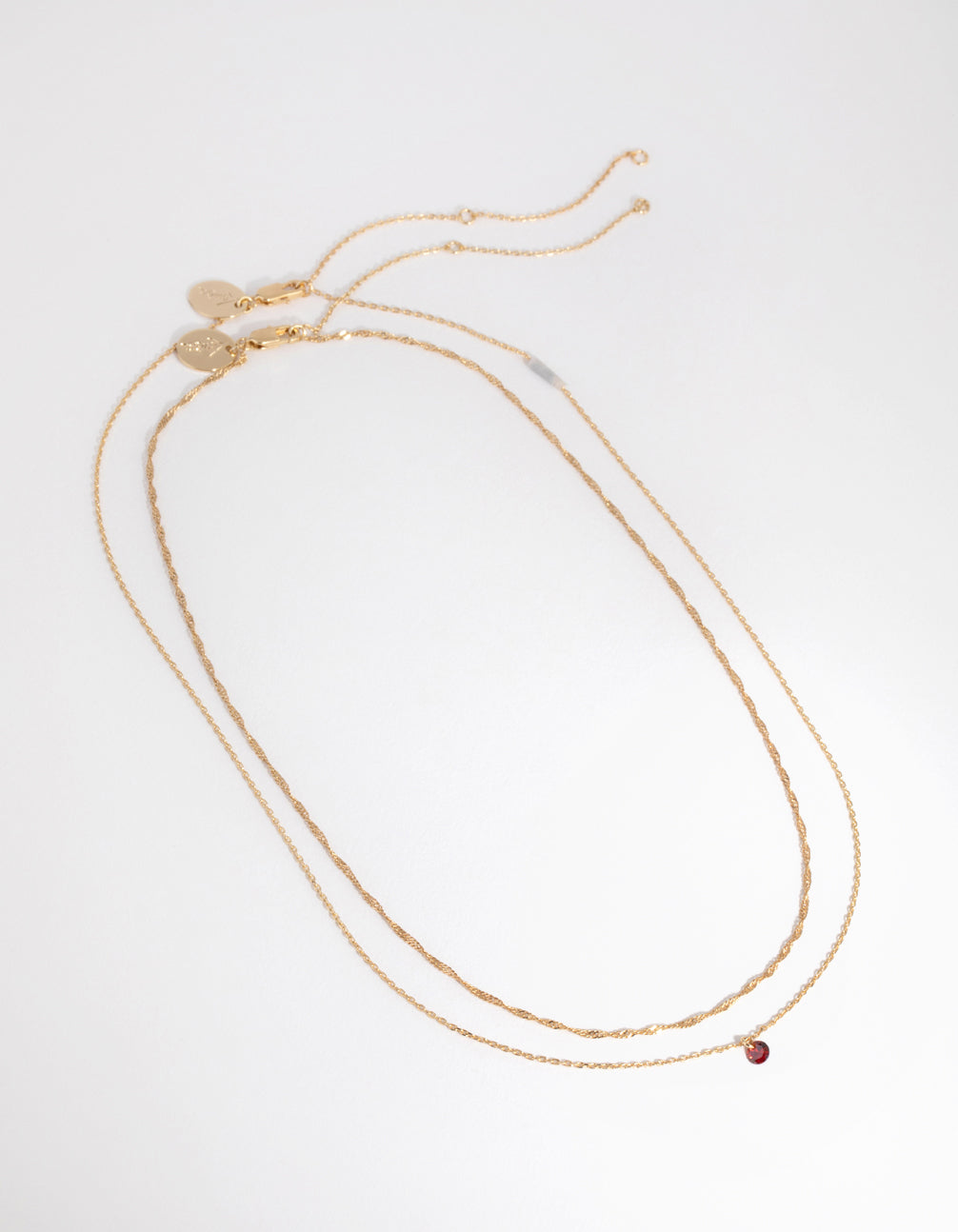 Be guided by the stars: a premium collection of thoughtful pieces that promote self-assurance and resilience through birthstones and the signs of the zodiac. This elegant necklace set is plated with genuine 18ct gold for authentic lustre and shine. It features two dainty chain necklaces. One boasts a Singapore chain and on the other a garnet-toned cubic zirconia gently rests on a fine cable chain. Garnet is the birthstone for the month of January, and it’s believed to promote prosperity and hope. Layer these lovely pieces together for daily inspiration.
