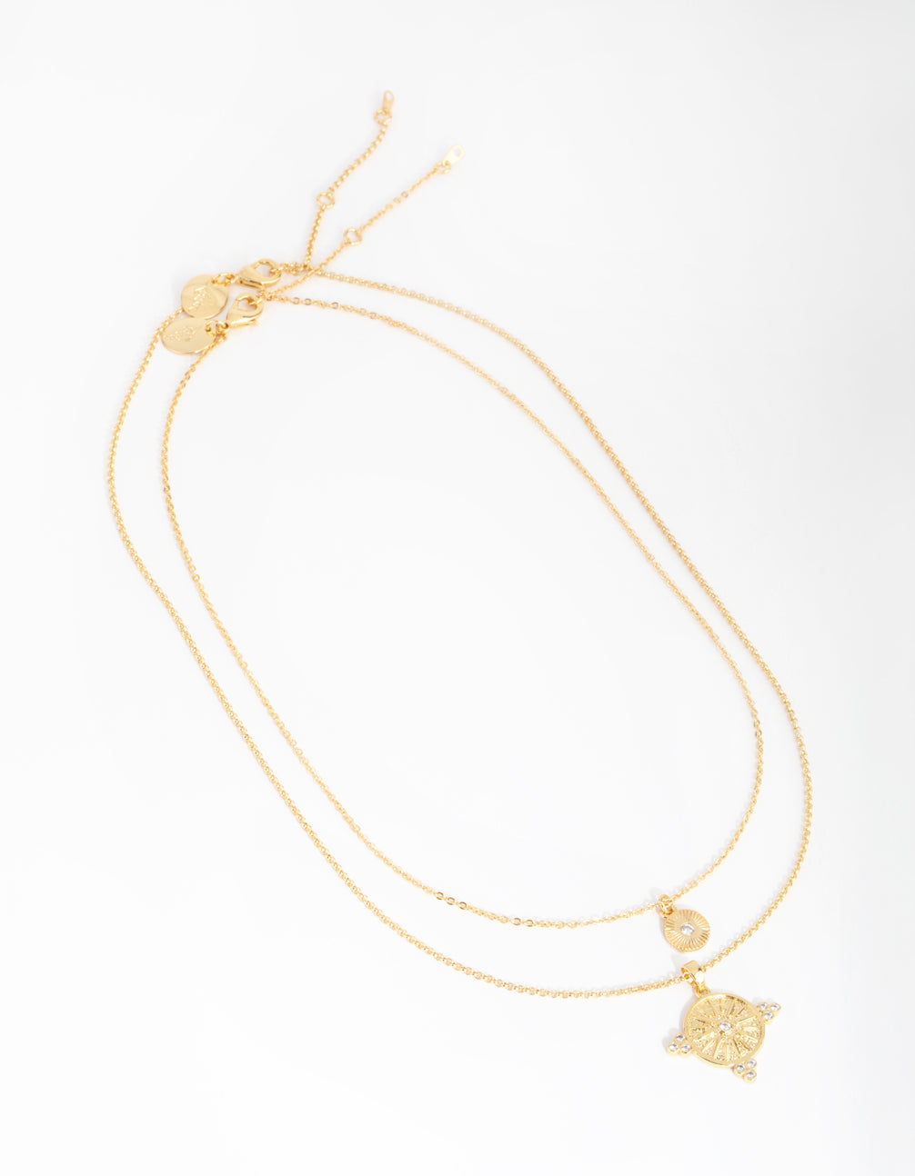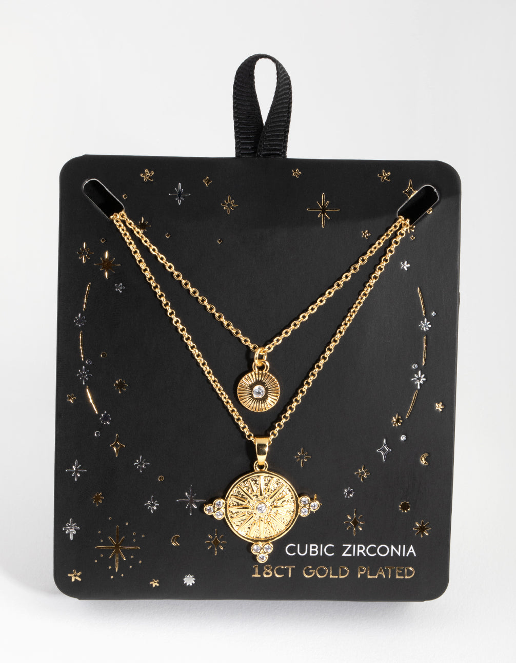Celestial, talisman and tarot-inspired pieces: a collection of vintage-inspired jewellery designed to be kept and treasured. This lovely necklace set is plated with genuine 18ct gold for authentic lustre and shine. The larger necklace features an ornate, coin-like pendant with a sun motif at its centre and cubic-zirconia embellishments. The smaller one features an etched circular pendant with a dainty cubic zirconia at its centre. Commanding yet beautiful, layer these ethereal pieces together and wear them as your personal talisman.
