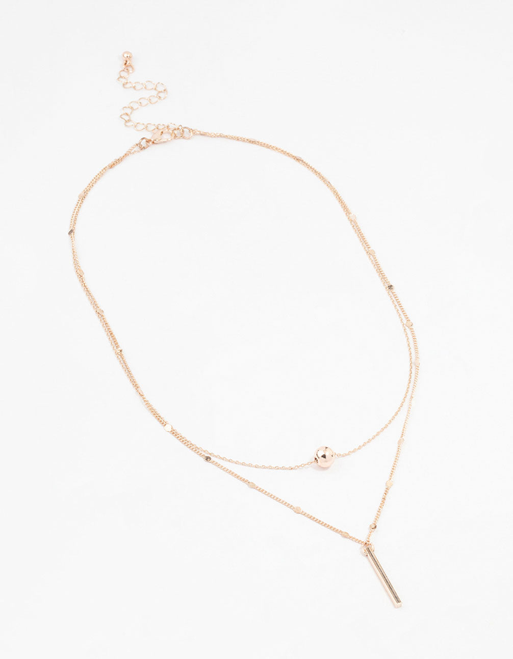 Embrace the art of layering and let this necklace be the centerpiece of your look, elevating your everyday style to new heights. This necklace features a rose gold base and bar and ball motifs for a boho but trendy finish.