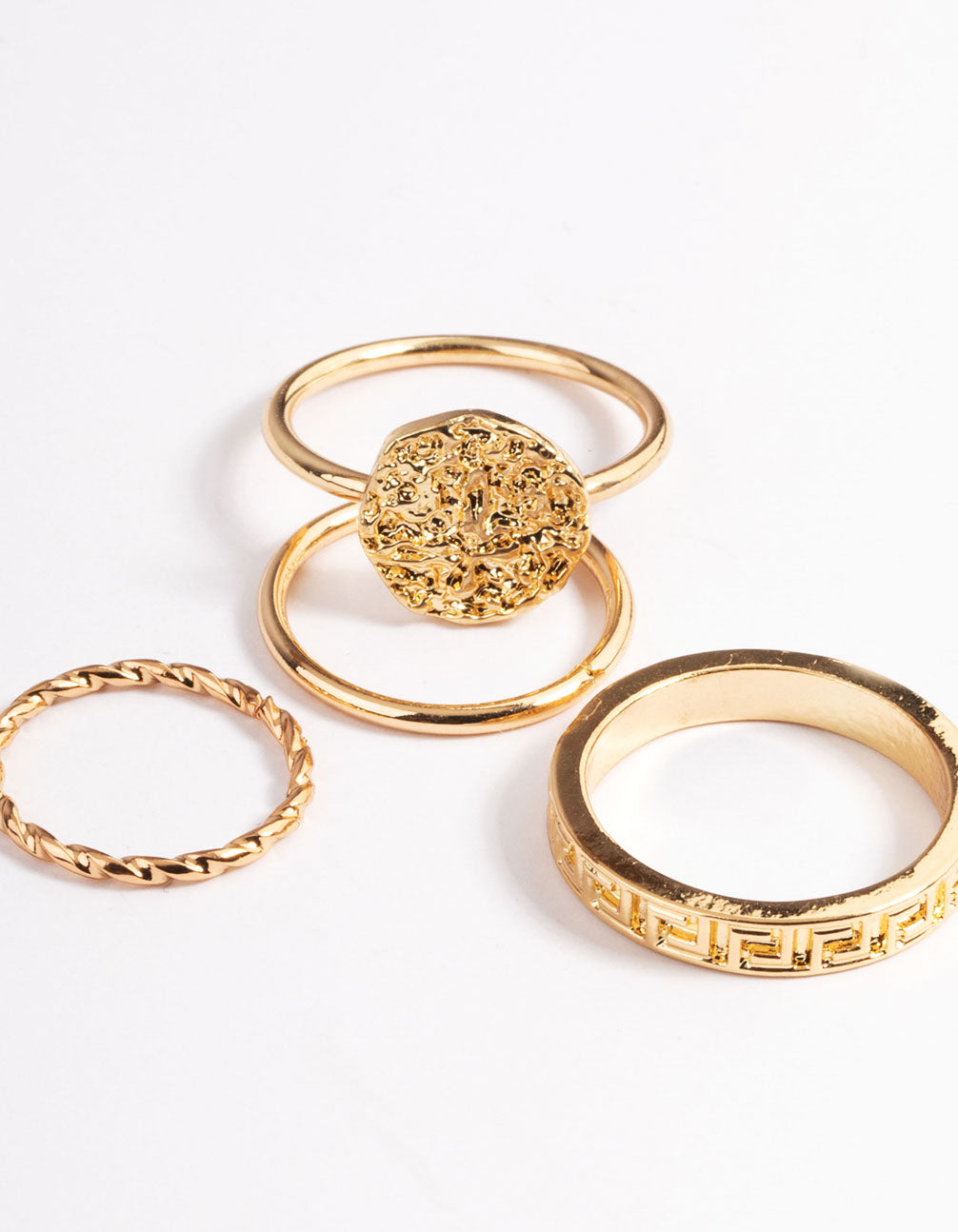 - Pair our gold-toned, textured disc ring pack with a gold statement ring for added dimension.