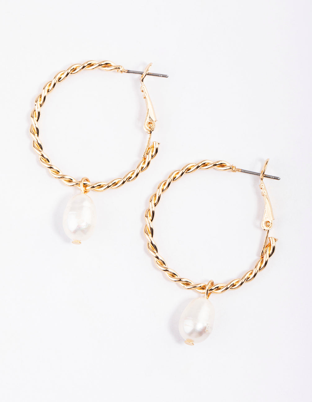 Gold Freshwater Pearl Twisted Hoop Earrings