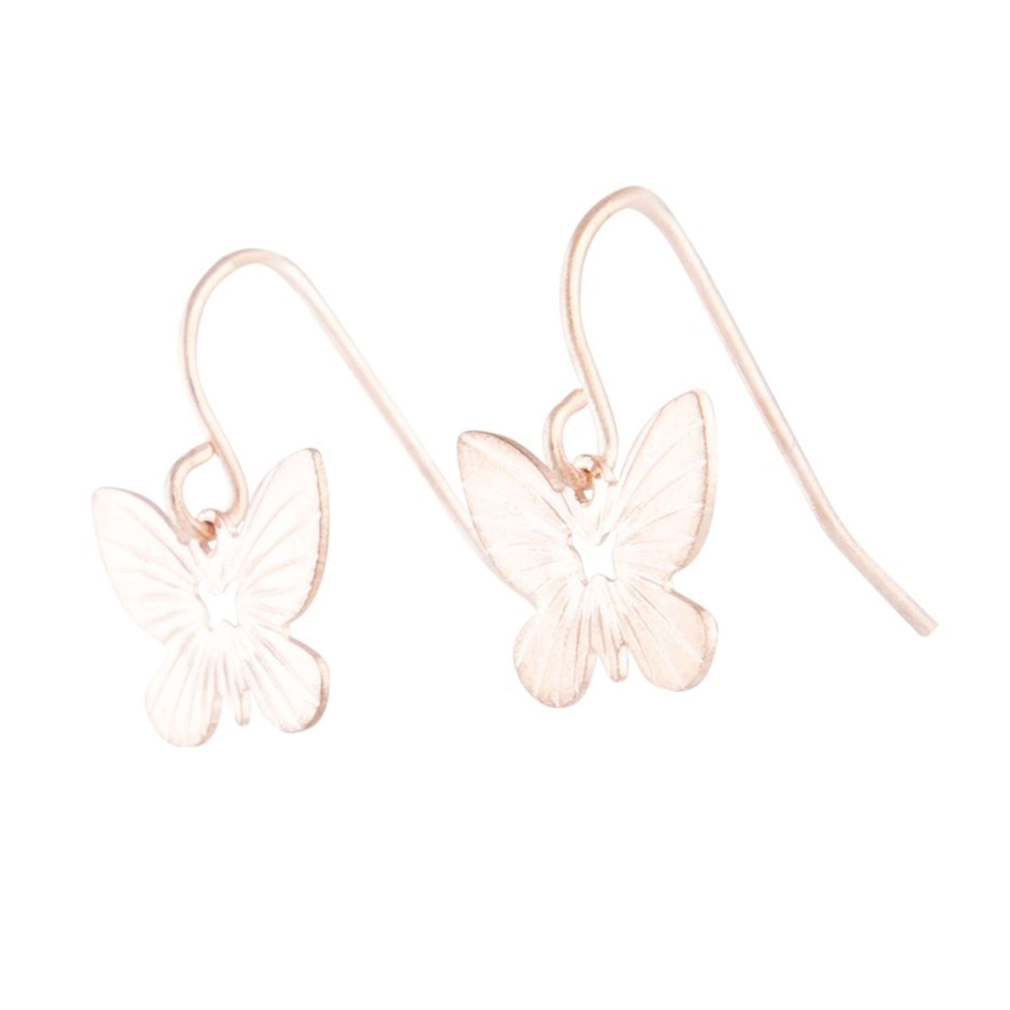 A pair of butterfly drop earrings in a rose gold tone.