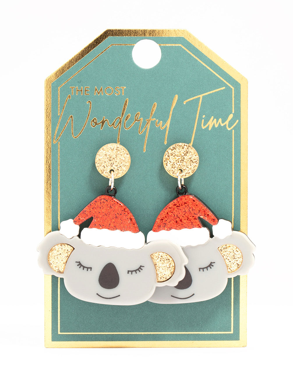 Spread holiday cheer with these adorable Acrylic Koala with a Santa Hat Drop Earrings. These acrylic drop earrings will add a festive touch to your look. Pair them with your favourite holiday outfit for a playful look.