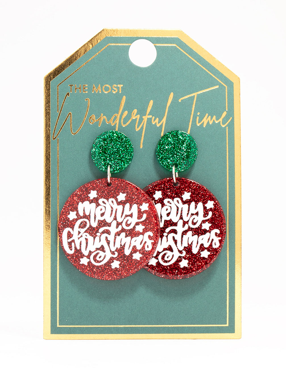 Bring the Christmas spirit with these fun drop earrings. With their cool bauble-like design, red and green tones, and cursive merry Christmas words, they really capture the jolly holiday spirit.