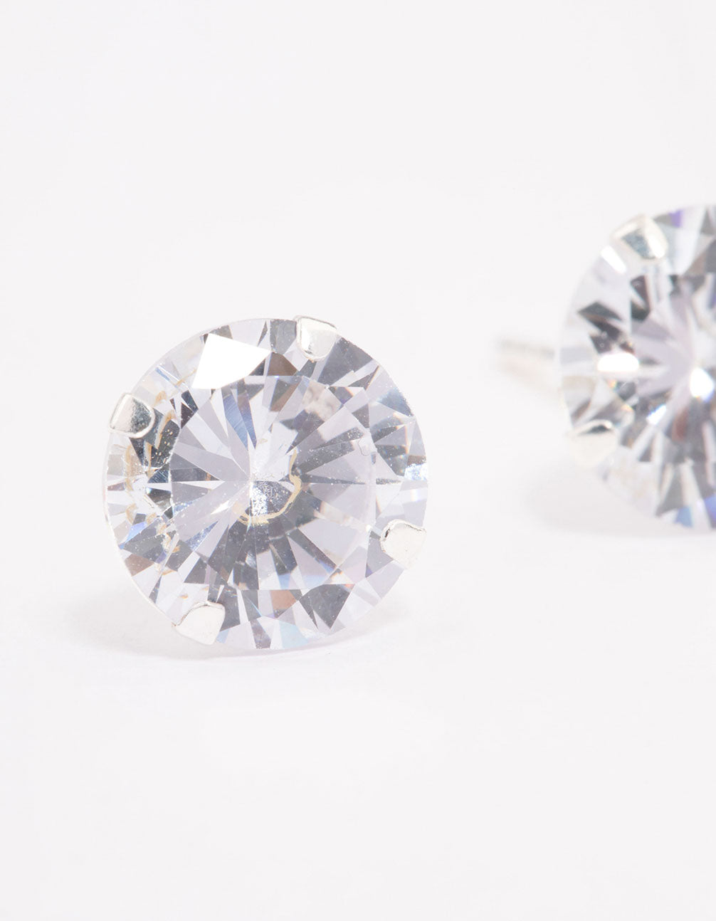 - This set of staple sterling silver stud earrings features a trio of cubic zirconia crystals for a hint of glamour.