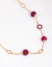 Give your outfit a romantic finishing touch with vivid reds and luscious pinks. This pretty gold-toned necklace features a series of ball details which are either thread-wrapped or embellished with seed beads. It boasts a mix of raspberry and mulberry hues on a gold-toned setting.