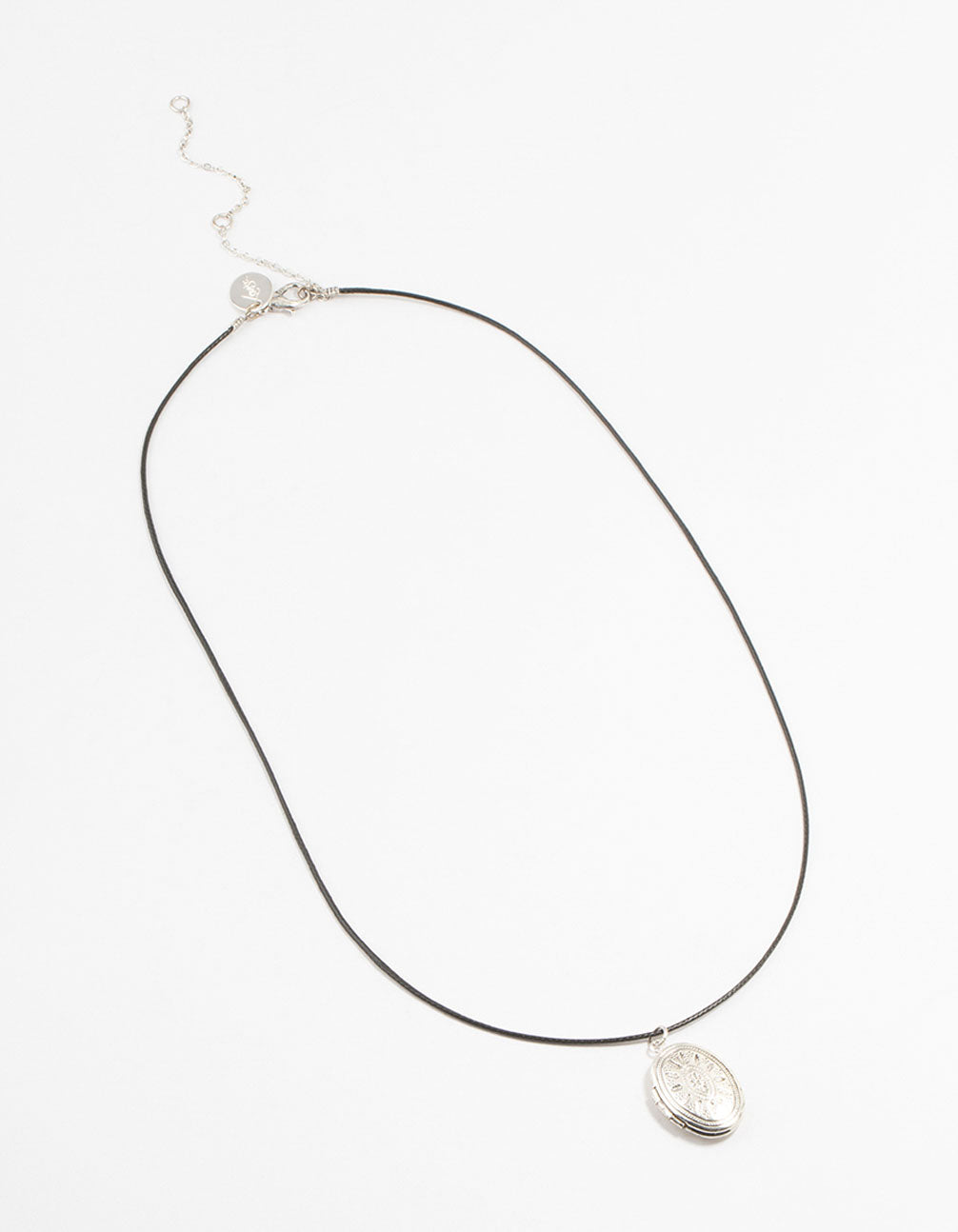 Embrace a clean, chic style with this sleek antique silver locket necklace. The edgy cord chain complements the elegant locket, adorned with intricate etchings on the antique silver base. This necklace blends sophistication and modern edge.