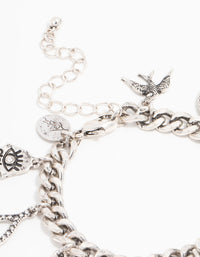 Add good fortune and luck to your look with this stunning charm bracelet! Crafted in antique silver, it features charms like horseshoes, Hamsa Hands, turquoise, and oceanic designs for a vintage, lucky vibe.