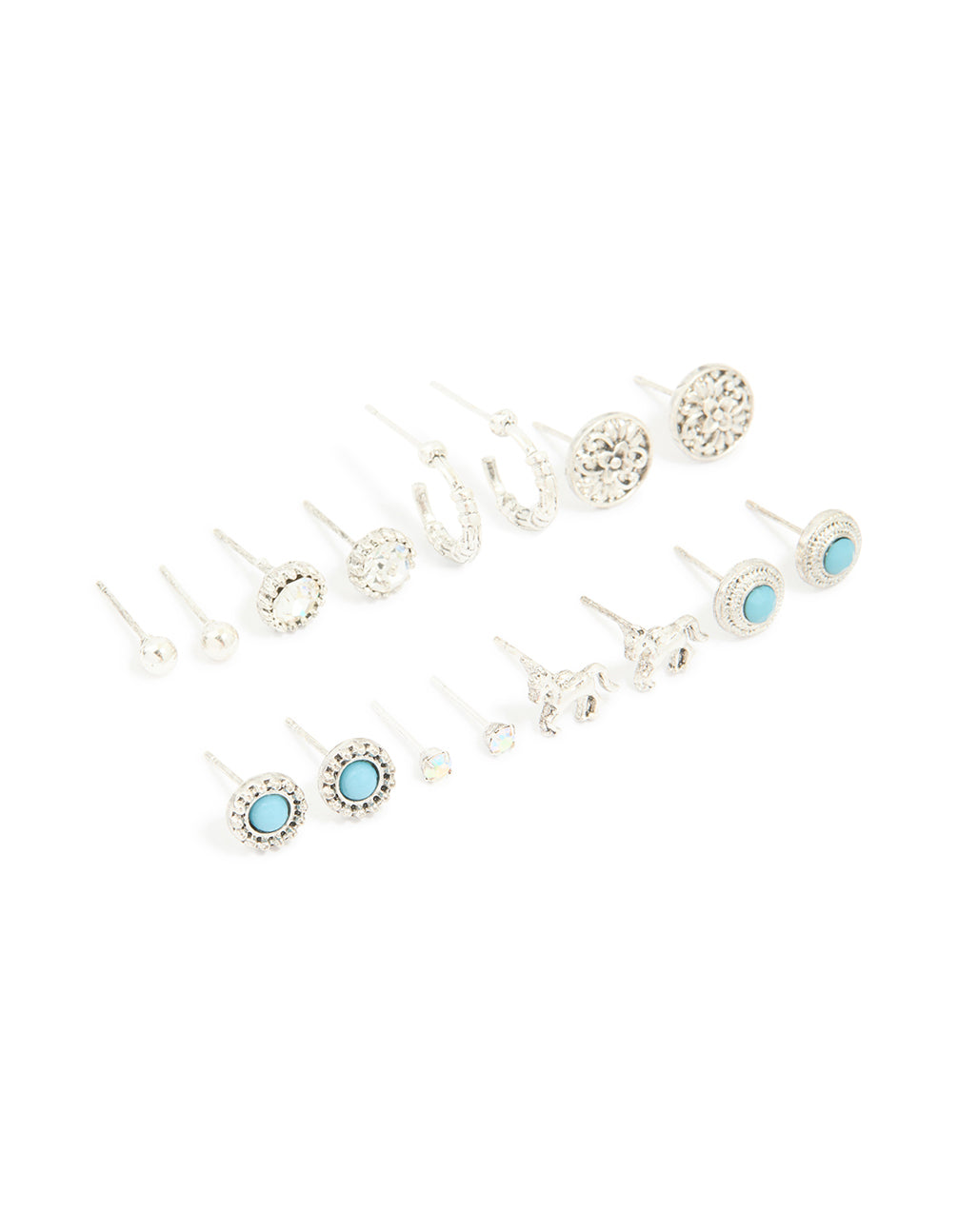 Level up your ear game with this Antique Silver Turquoise Stone & Unicorn Stud Earrings Pack. This fun earring set includes ball studs, diamante stud earrings, open bamboo hoops, etched floral studs, turquoise stone studs, iridescent diamante studs, unicorn stud earrings and ribbed antique silver-look studs. Perfect for mixing and matching, this ear pack goes with everything from jeans and a tee to a cute dress. Wear them to festivals, parties, or every day when you want your jewellery to feel a little bit magical.