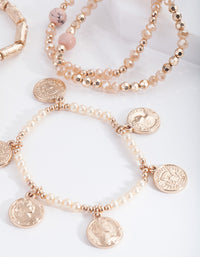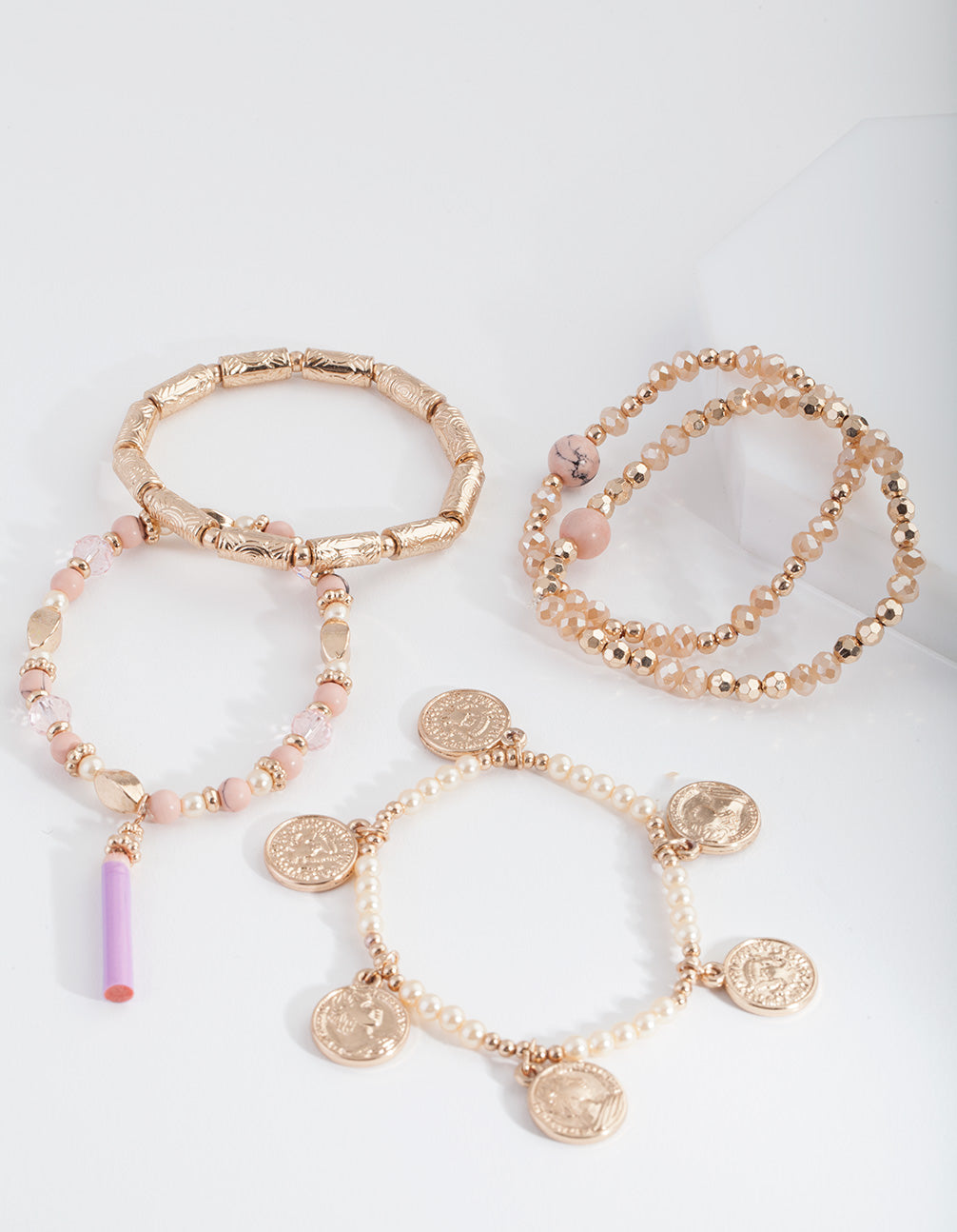 Hello sunshine - this is the perfect mixed bracelet set for your summer and vacation outfits! This pack includes five stretch bracelets with pink beads, faux pearls, dangling coin and gold-toned details. Pair them with pink, yellow and orange tones to match your outfit with the sunset.