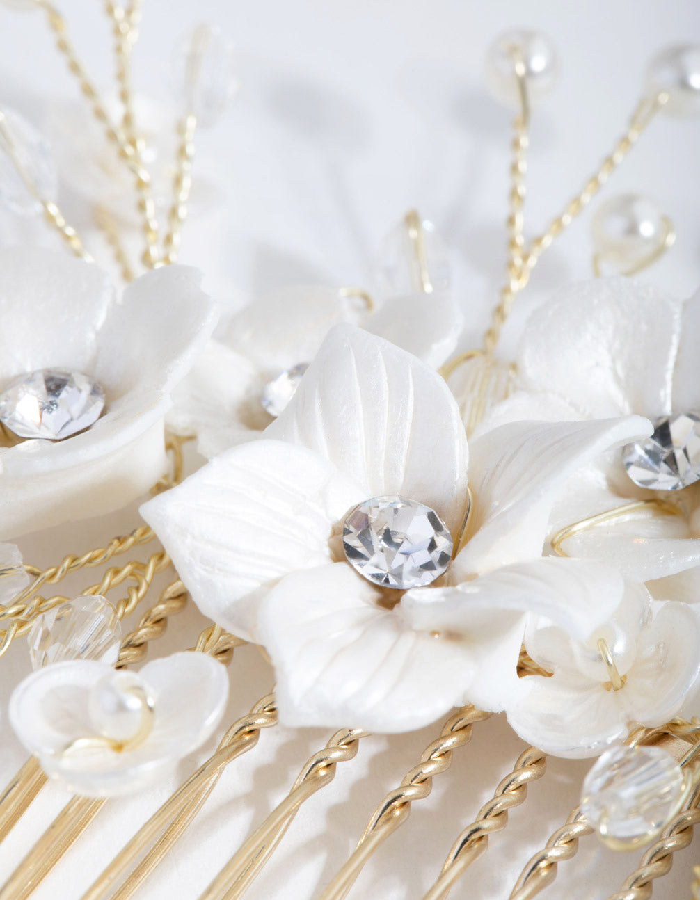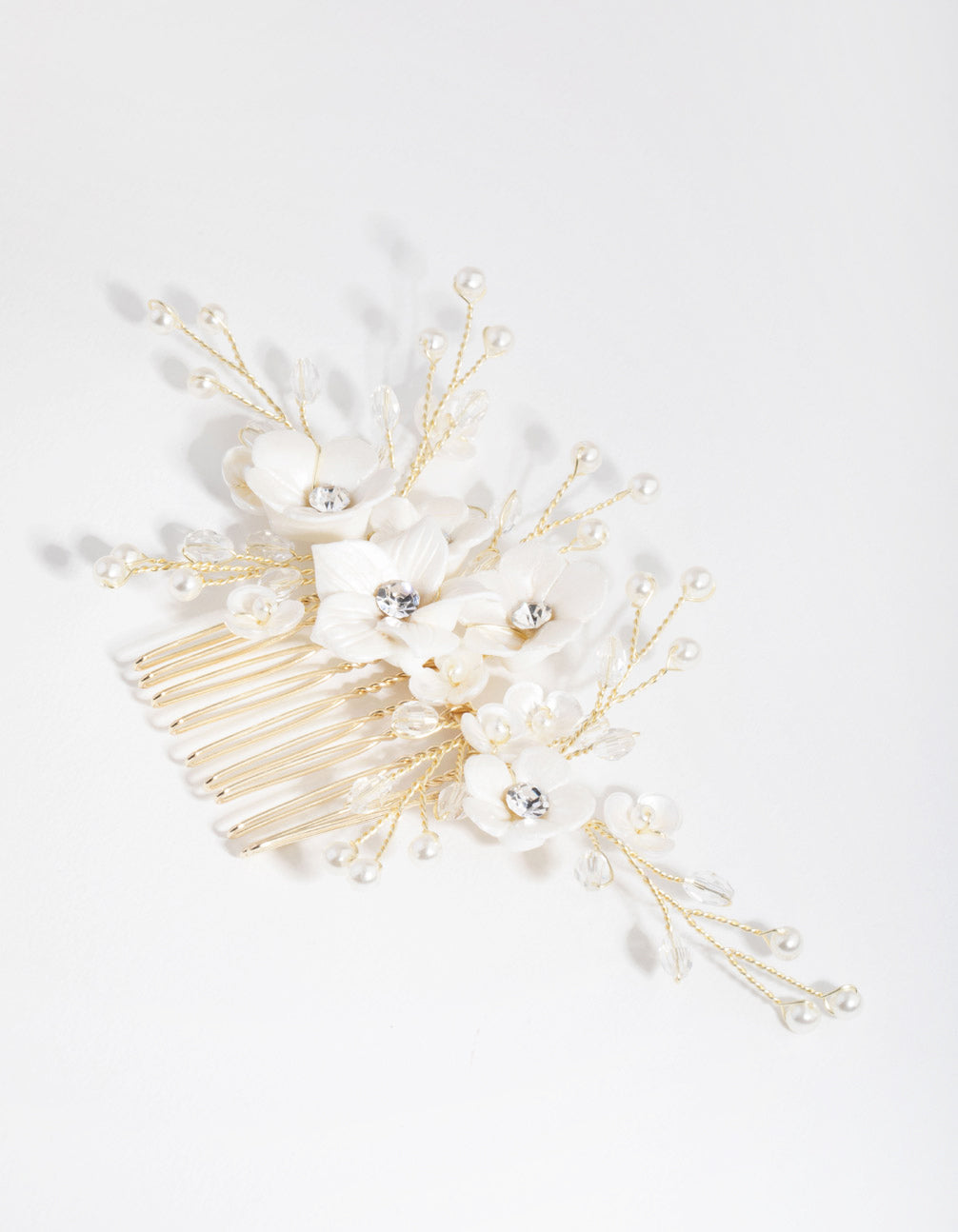 Add a touch of whimsy to your outfit with glittering hair accessories. This hair comb features beautiful, pearly-white flowers and it's studded with faux pearls for maximum shine. Wear it and get noticed!