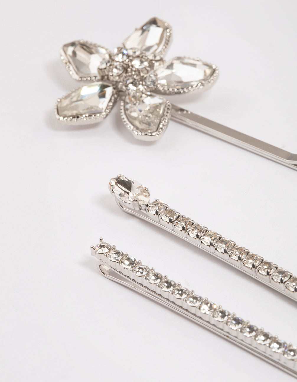 - Elevate your hairstyle with these silver-toned, diamante-embellished floral hair clips.