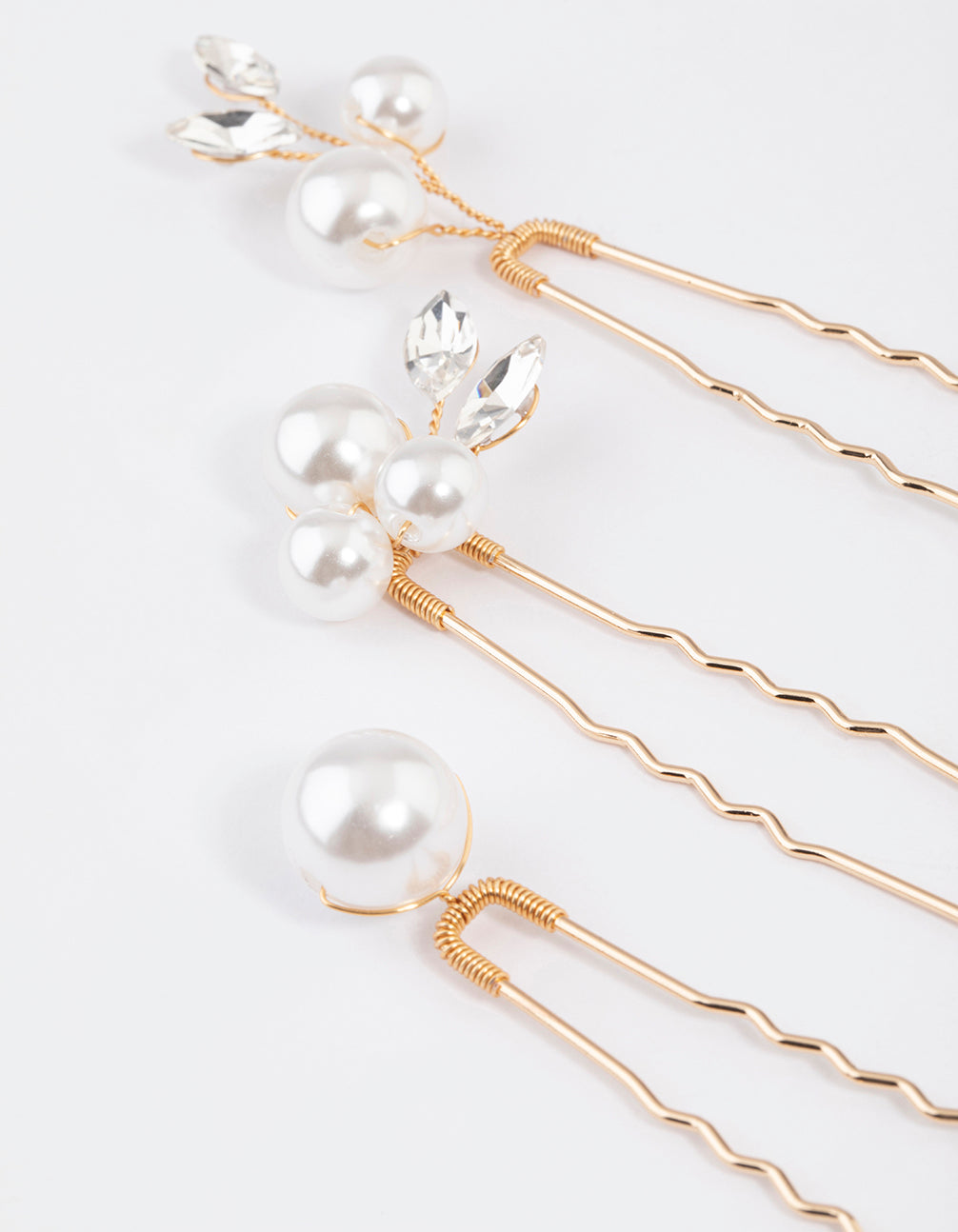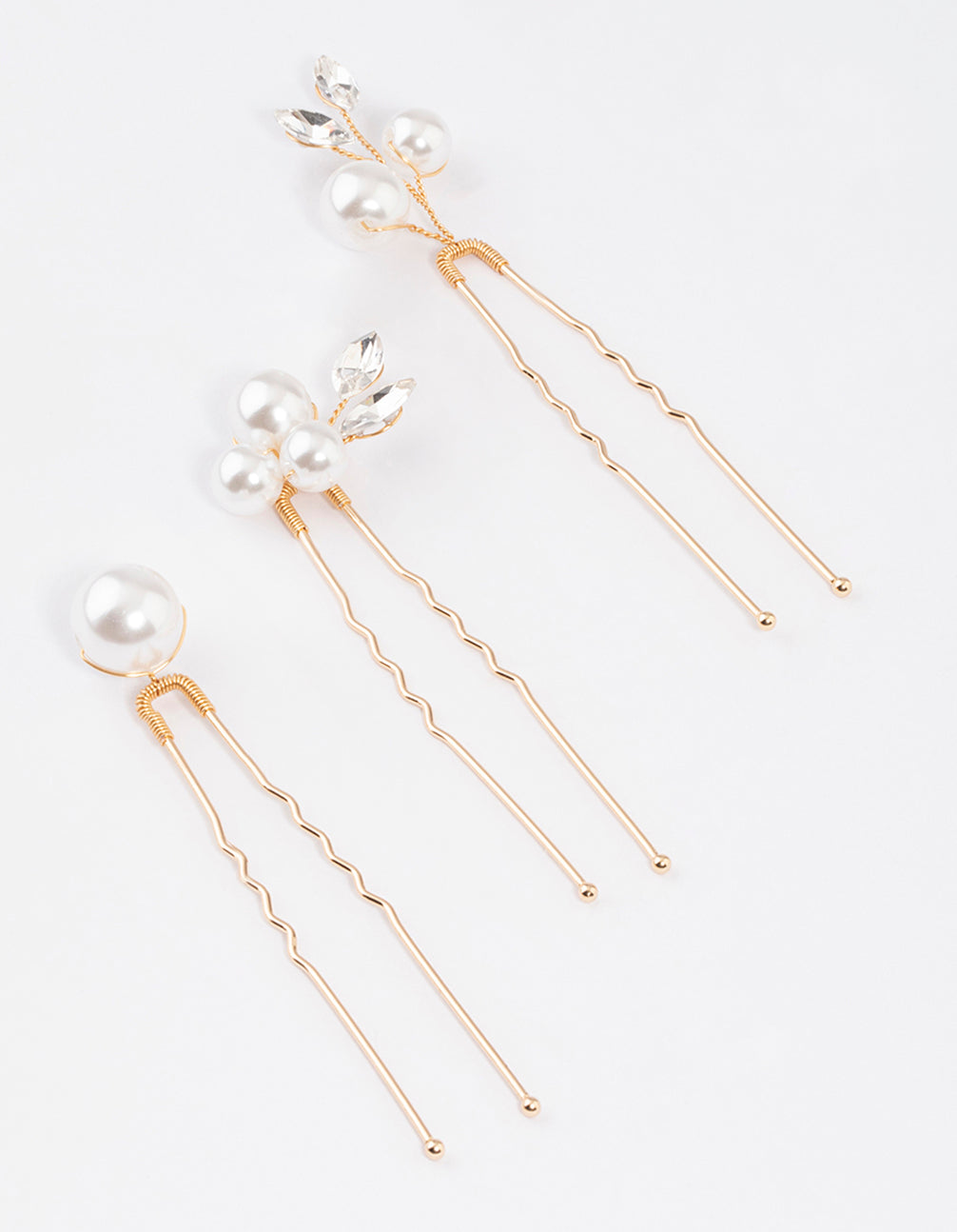 - This hair pin pack contains three individual, gold-toned, pearl-embellished hair clips - perfect for placing in a bun or pinning the hair back.