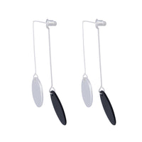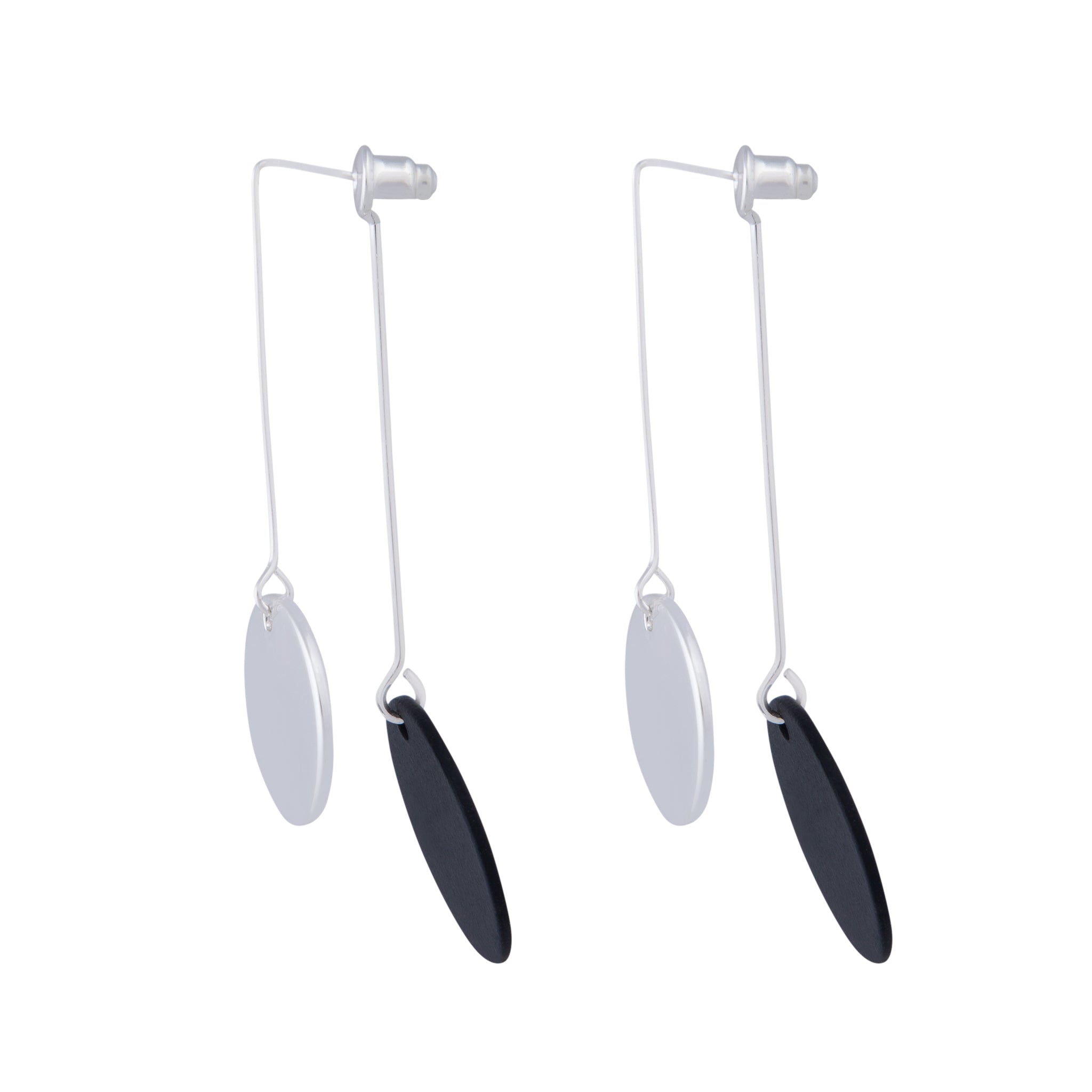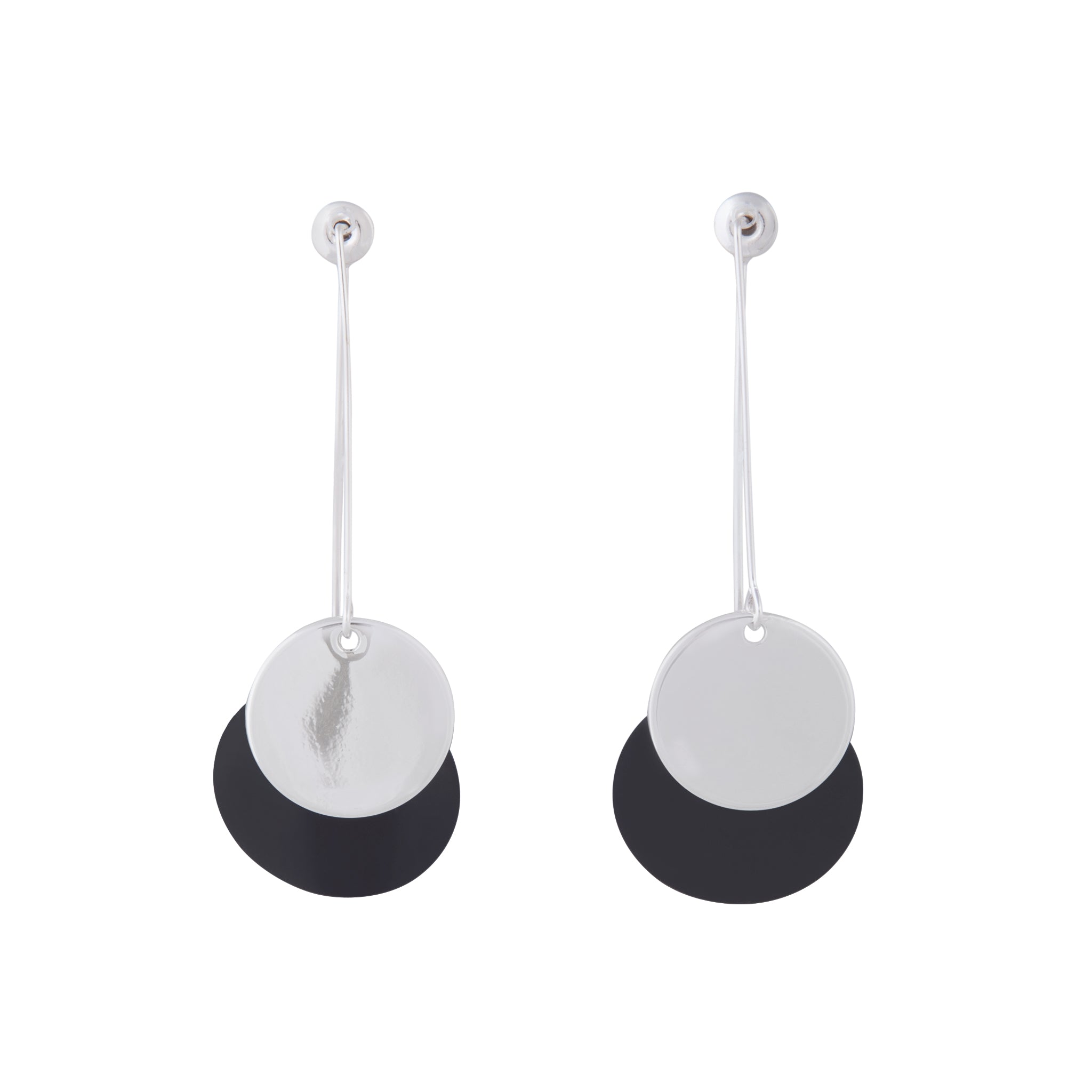 Hypnotize in these contrasting pendulum earrings with polished silver-tones and matte black discs suspended on two solid metal bars.