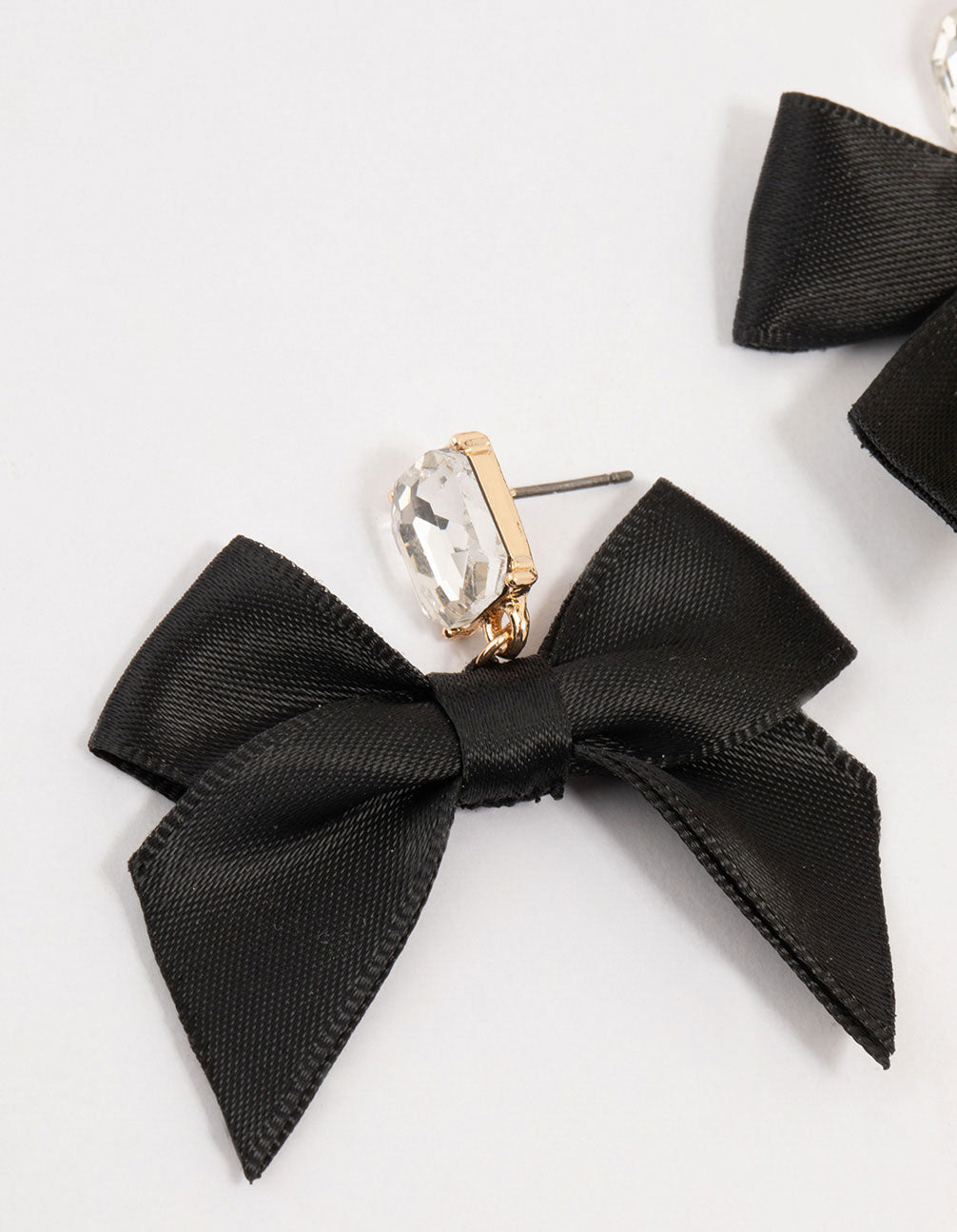 Bring the coquette inspired flair with this flirtatiously fun earrings. These Add a flirty touch with these coquette-inspired earrings. The playful black bow drop and sparkling diamante center are perfect for a preppy, pretty look.