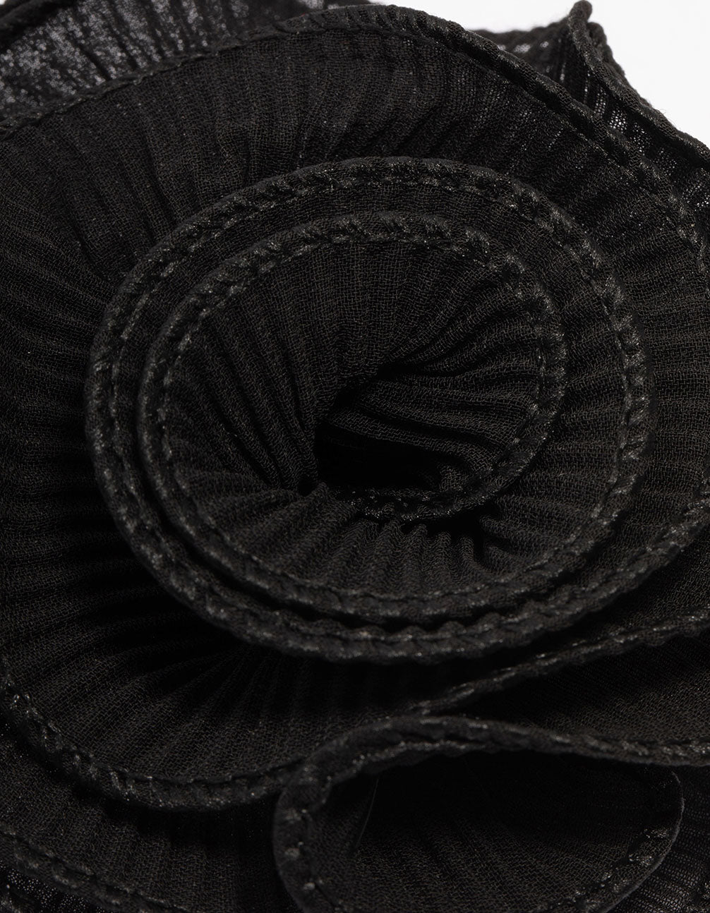 Add a textural touch to your hairstyle with this white fabric hair clip. This hair accessory features a black spiral flower design, adorned with an alligator clip on the back.