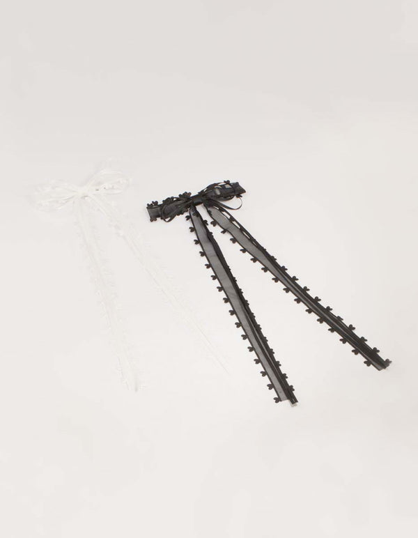 Upgrade your hair game with this stunning bow pack! Featuring two charming bows—one black and one white with heart motifs—these ribbon bows add a delightful touch to any hairstyle.