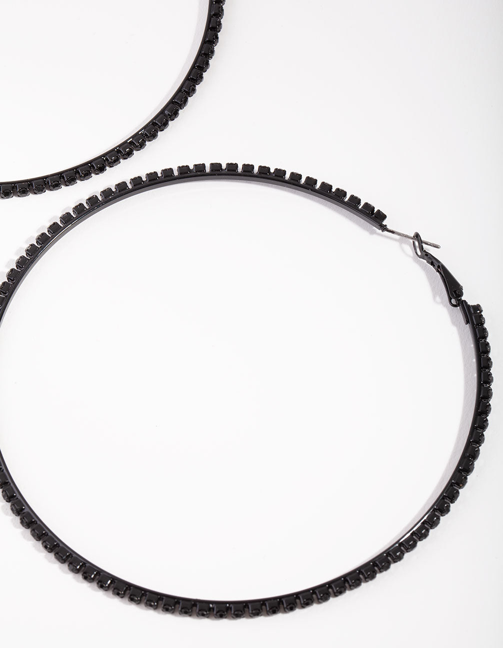 Your new statement hoops are here! These large, black-toned metal hoops feature black diamantes and an easy-to-wear clasp. A great addition to your evening look!