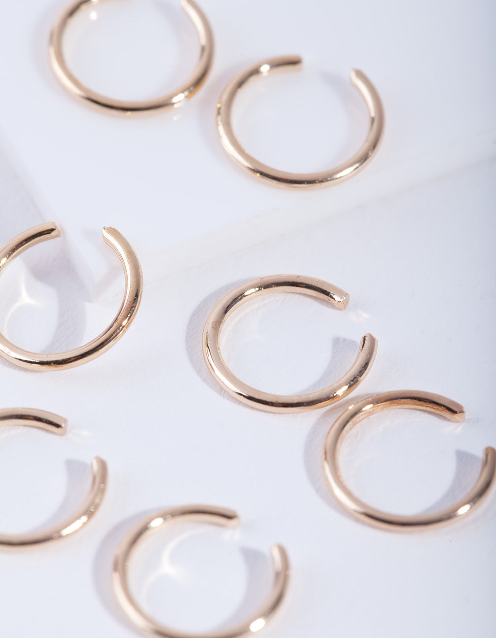 This pack features eight fake piercing rings in a gold tone. Trial and experiment with fake piercings; no needles necessary - just interchangeable style! These rings can be used for faux lip, ear or nose piercings. Try layering the varying sizes to create the look of an on-trend 'ear stack'!