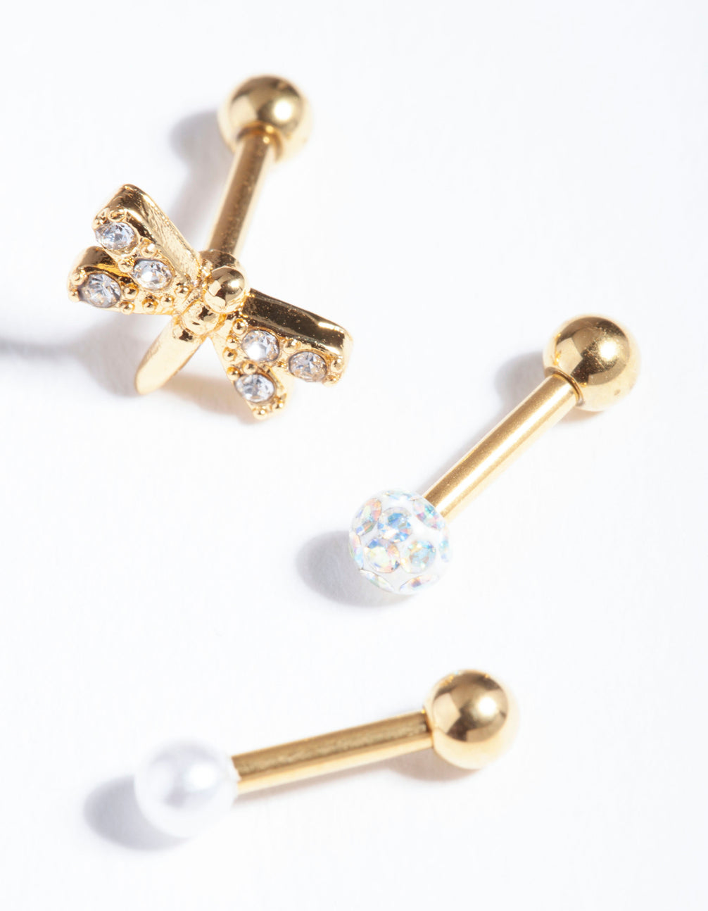 This versatile pack of barbel piercings contains three individual, gold plated barbels designed with cubic zirconia crystals for a stand-out finish.