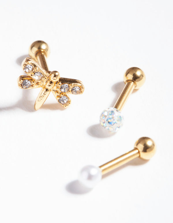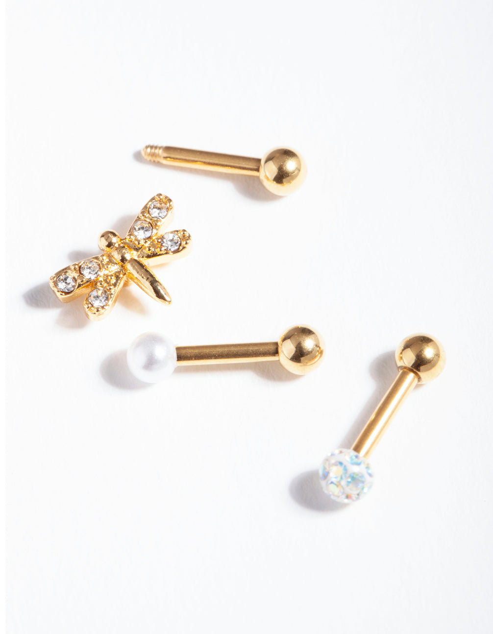 Gold Plated Surgical Steel Diamante Dragonfly Barbell Pack