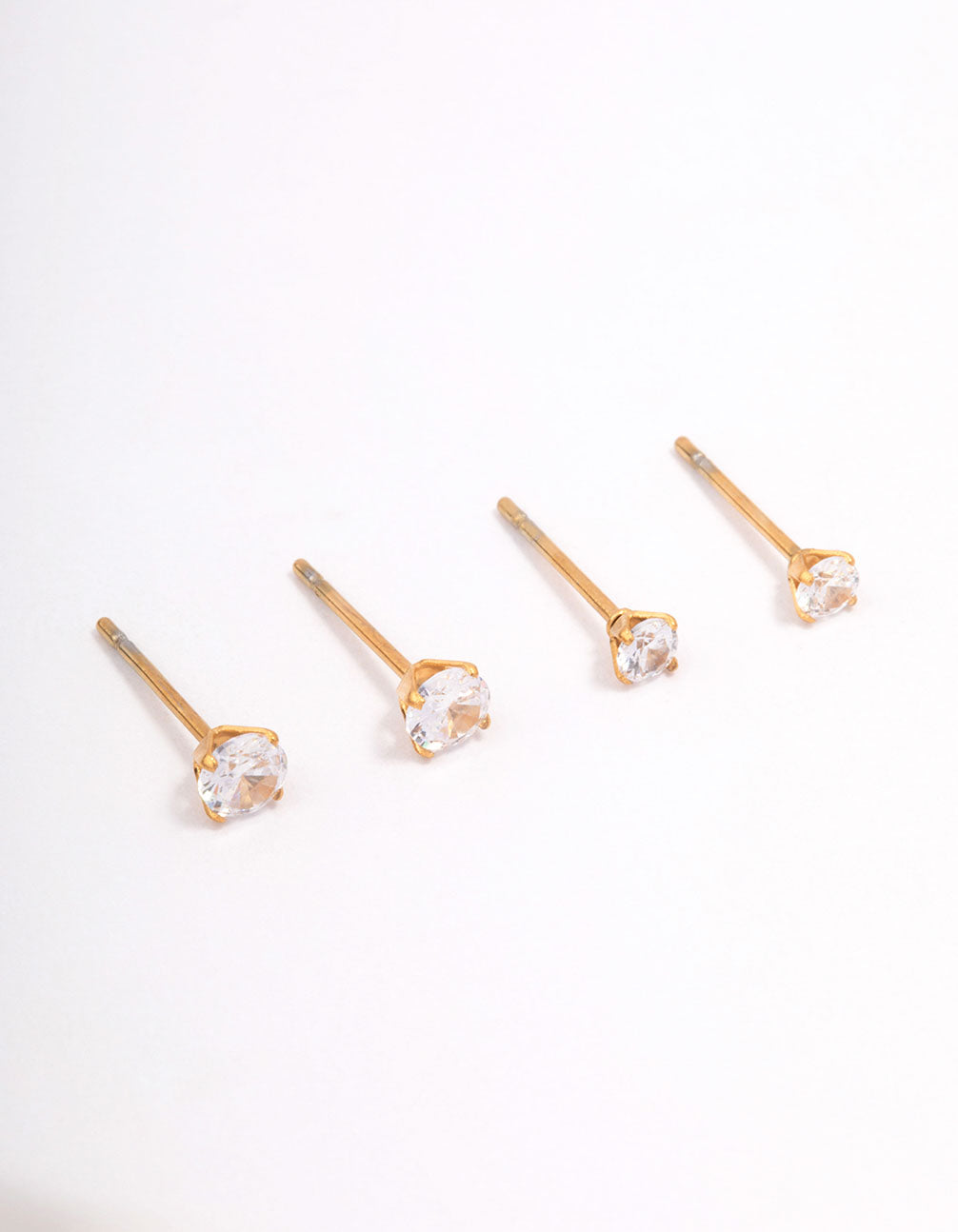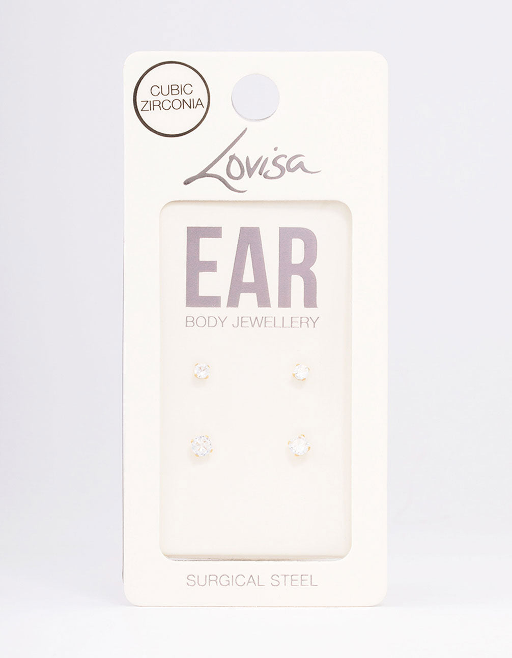 - This gold plated surgical steel earring pack contains two sets of stud earrings embellished with cubic zirconia crystals in a graduating design for added interest.