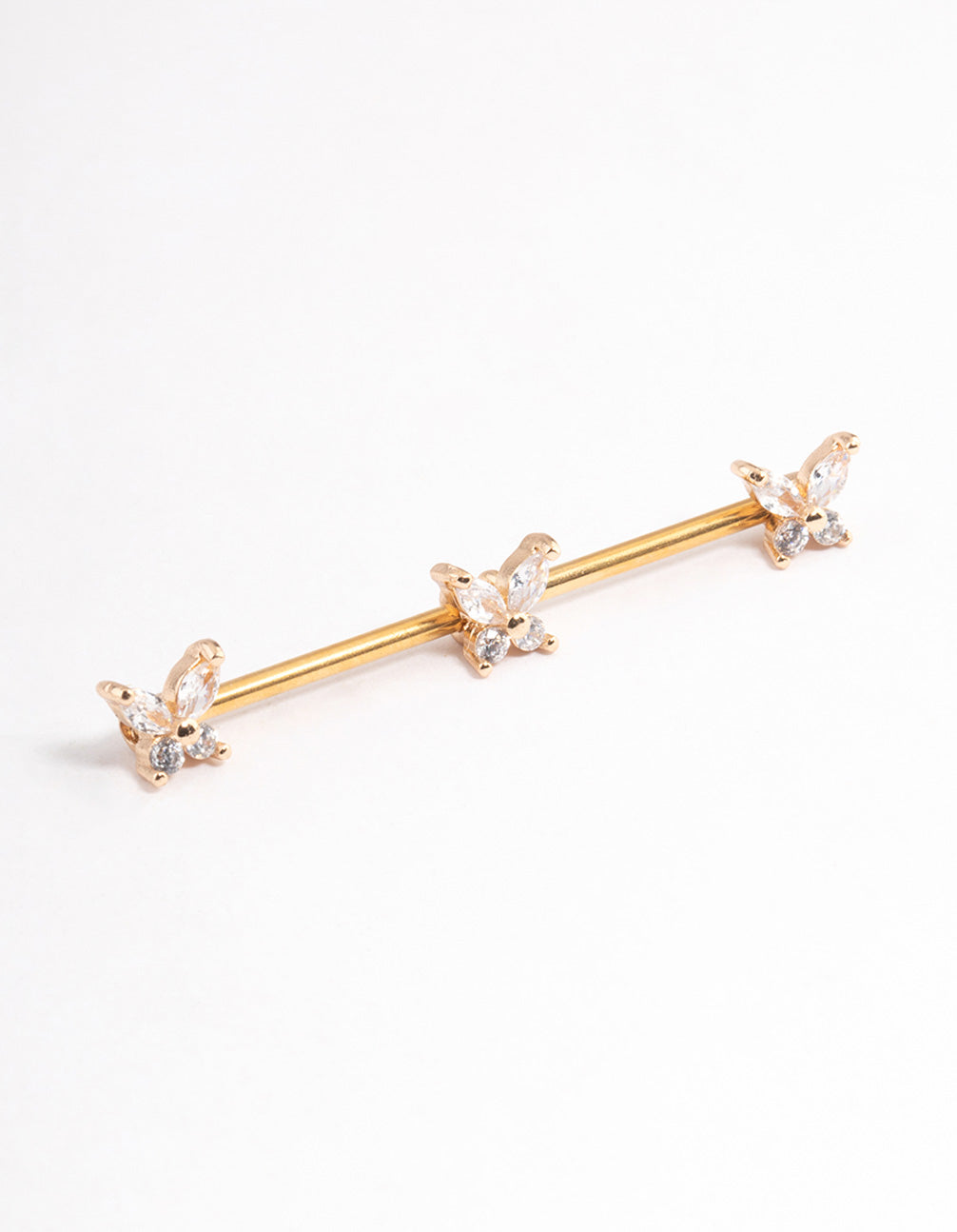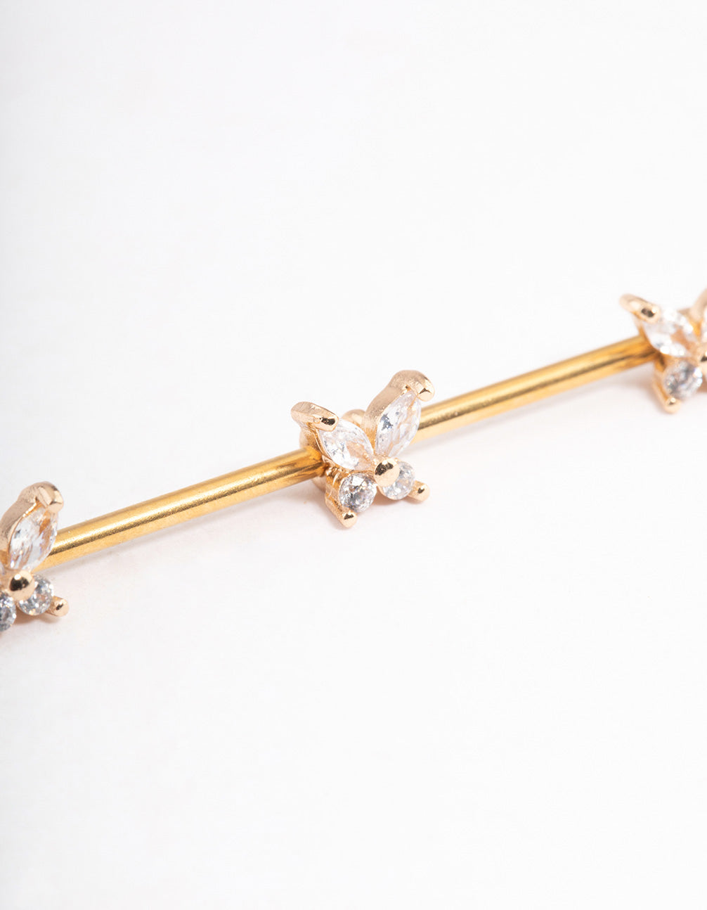 - This industrial bar is crafted with real gold plating and surgical steel, and is embellished with small, cubic zirconia butterflies for a feminine touch.