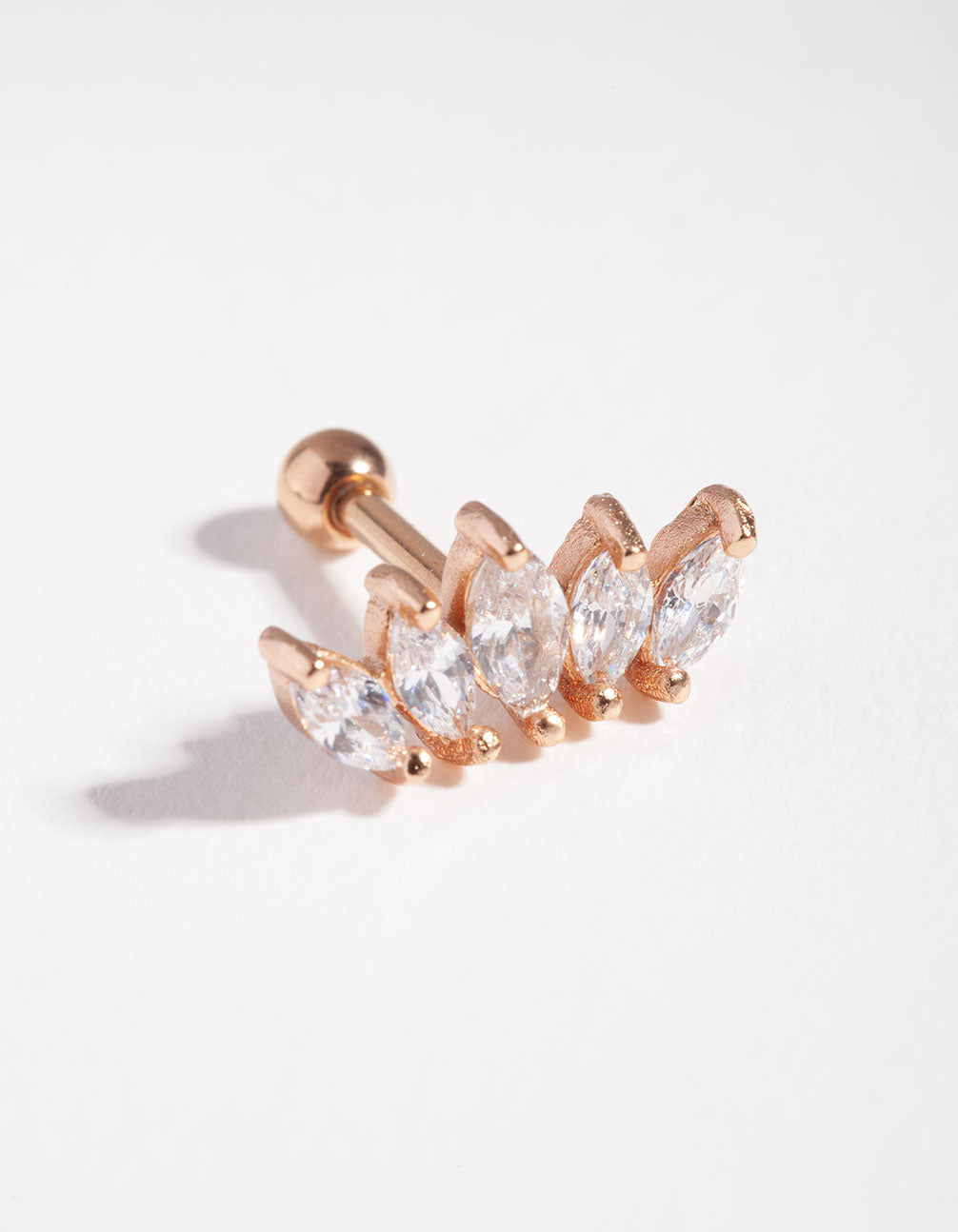 Make a statement with a fashion barbell piercing! This piece is rose-gold-toned and boasts beautiful marquise stones that are sure to catch the light. This piece has a surgical steel post, which makes it mo re gentle for daily use. It has a gauge of 16 and is 1.2mm in length.