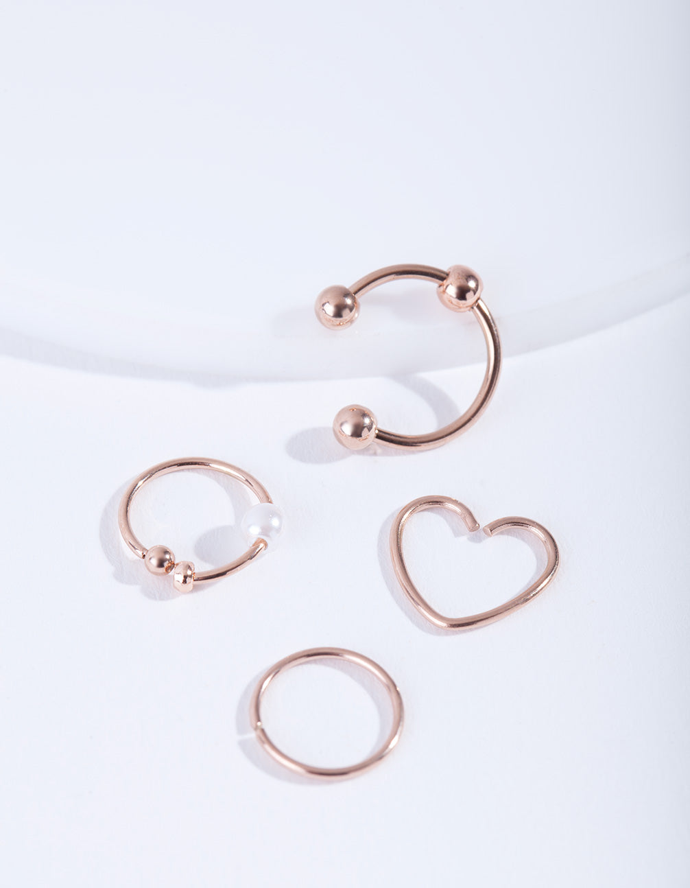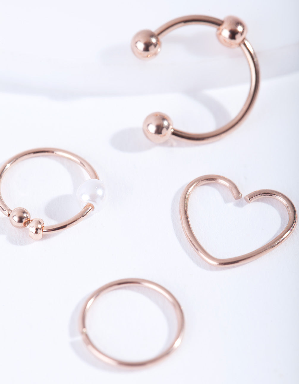 This pack boasts a variety of styles in a rose-gold tone with a heart motif. They have surgical steel posts, which makes them more gentle for daily wear. This is a mixed gauge pack. Cartilage earrings look great as helix, conch and tragus piercings. Wear the earring set on it's own or stack multiple piercings with other rose gold designs (eg. hoops, huggies, studs etc.)