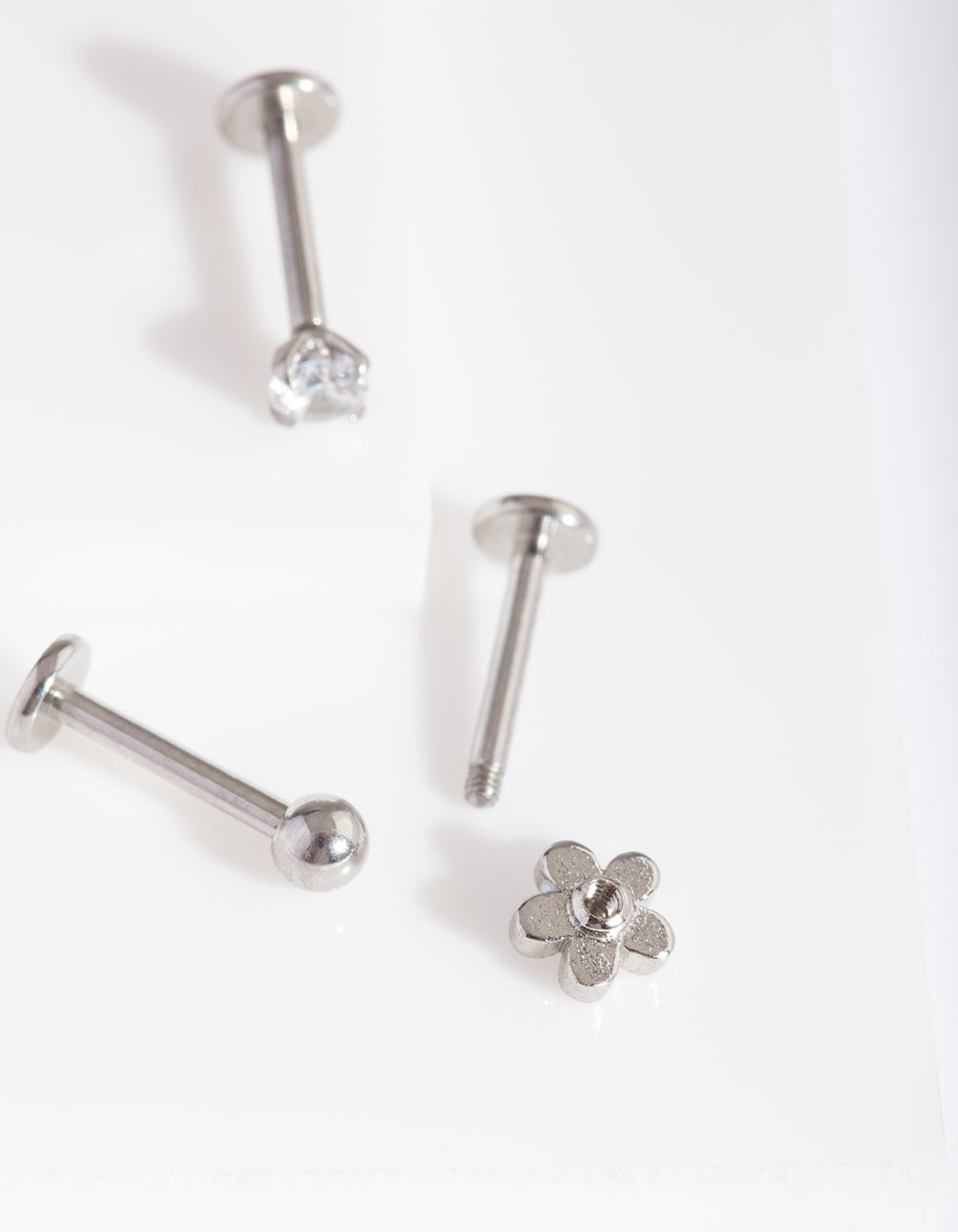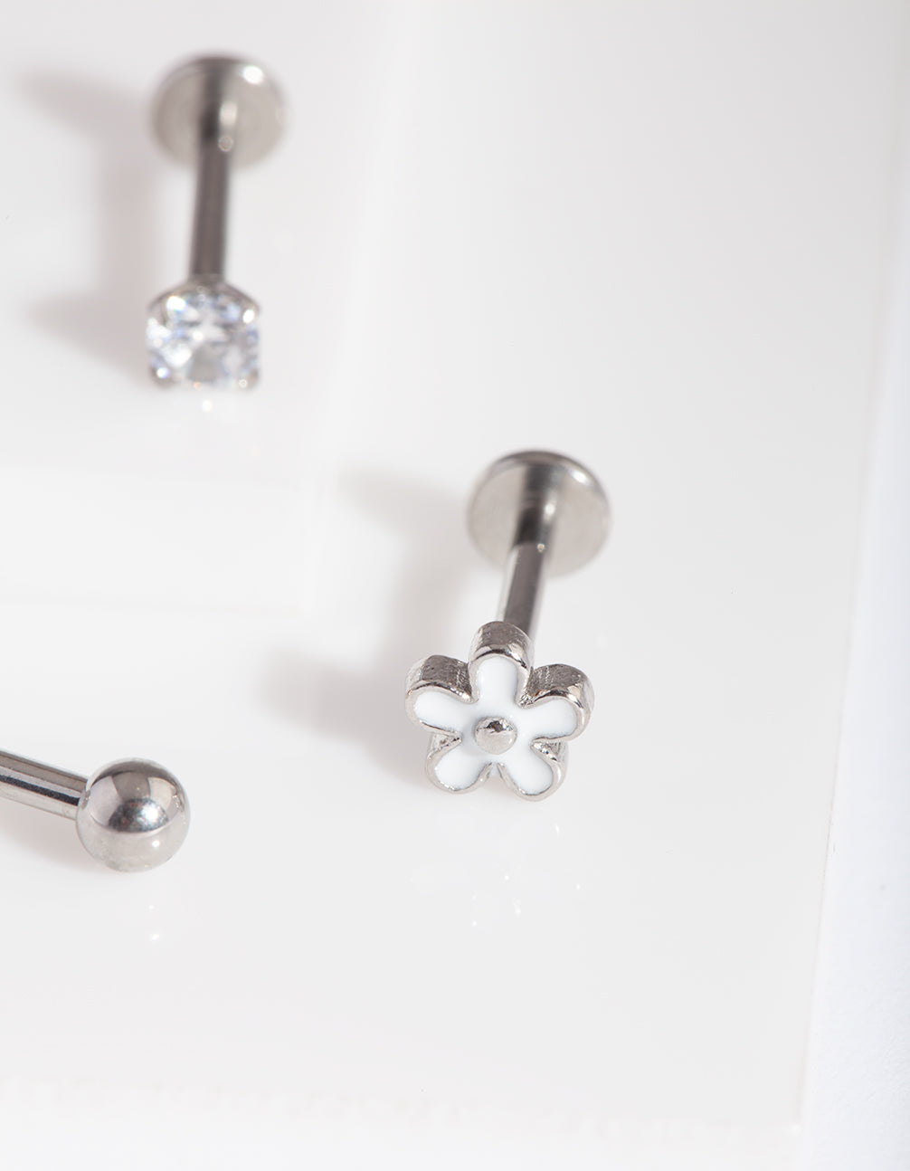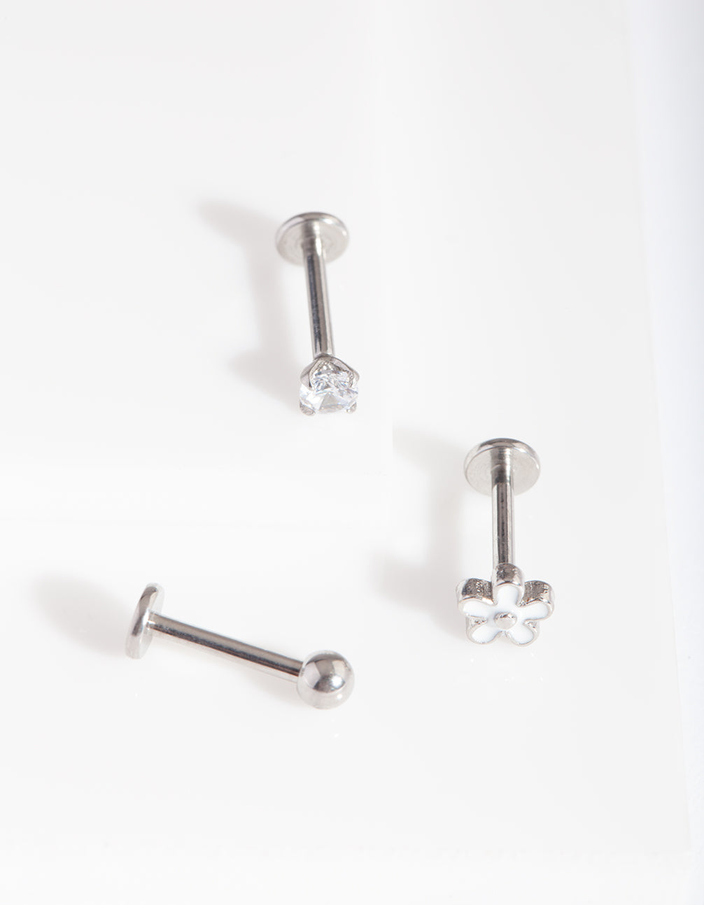 Lovisa body jewellery is made from surgical steel, making it perfect for daily wear. This pack comes with a trio of classic, silver-toned flat back earrings with a floral and diamante motifs. These pieces have surgical steel posts. Cartilage earrings look great as helix, conch and tragus piercings. Check out our cubic zirconia range for accessories to match!