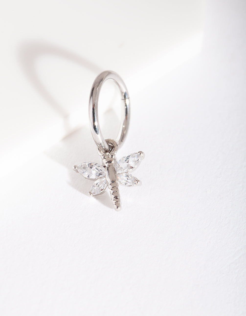 This single clicker ring comes in a silver tone and is perfect for multiple ear piercings. This silver-toned style features a diamante dragonfly design and is made from surgical steel, making it ideal for daily wear. Cartilage earrings look great as helix, conch and tragus piercings. Wear the earring on it's own or stack multiple piercings with other silver designs (eg. hoops, huggies, studs etc.)