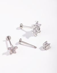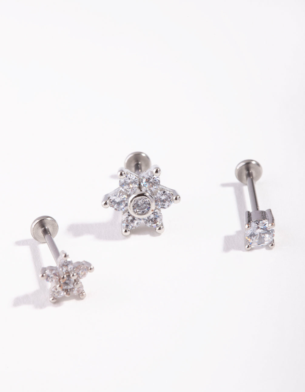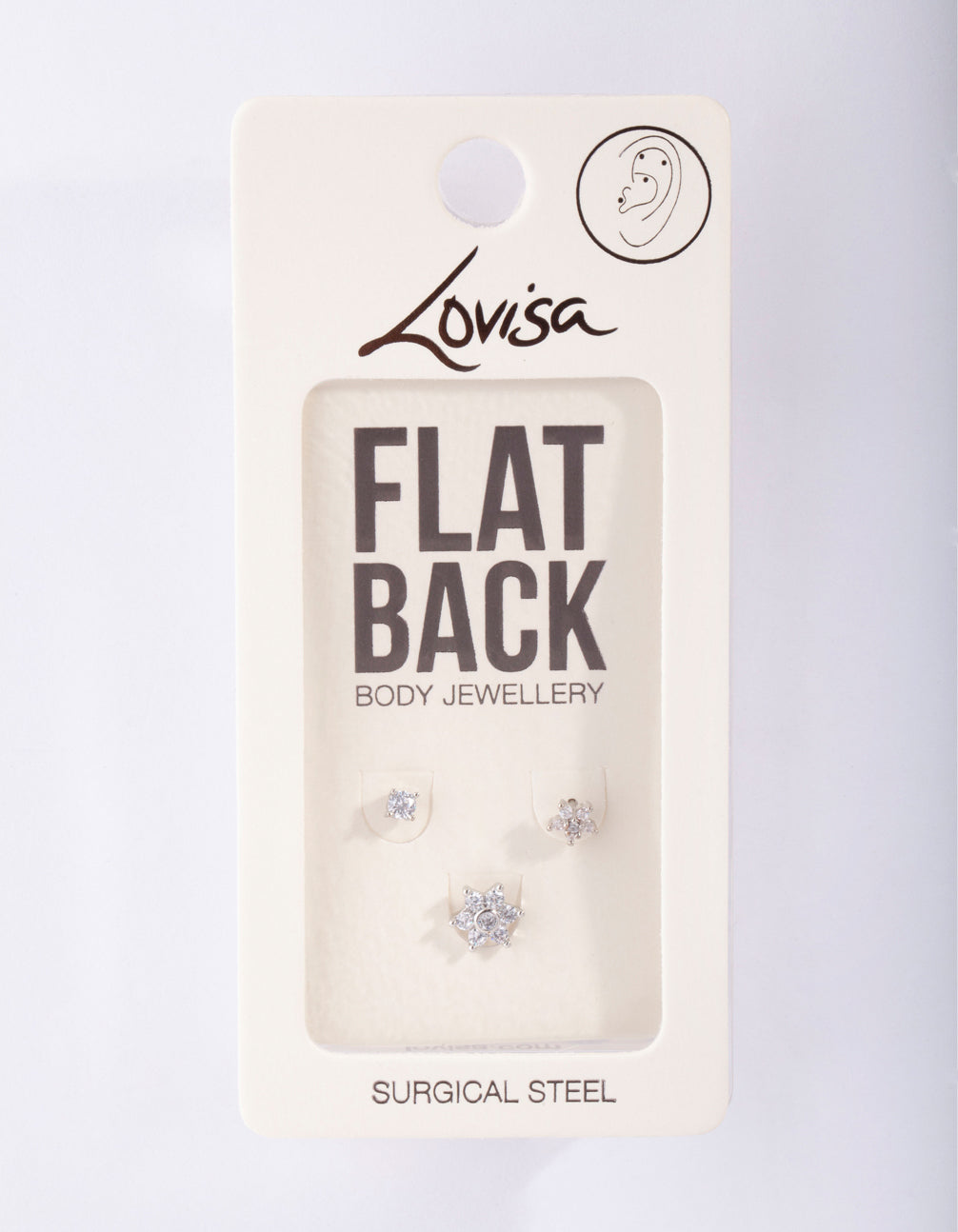 This silver-toned set features beautiful flower designs studded with diamantes. Pieces have surgical steel posts.