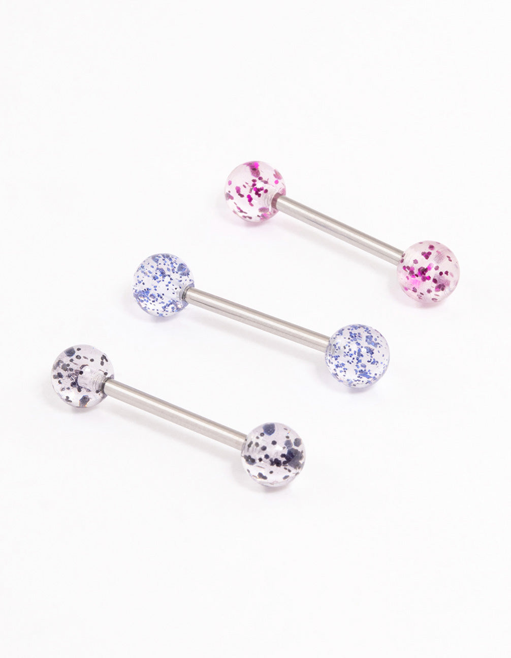 - This set of tongue rings contains three individual rings with glitter accents for a playful finish.