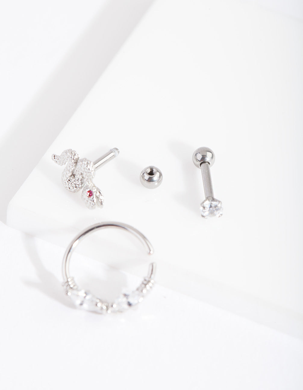 This silver-toned barbell earring pack comes with an embellished snake, diamante and ring design. Items have surgical steel posts. These versatile designs can be worn in so many ways! Try them as a cartilage earring for your helix, conch, rook, tragus or septum; the options are endless. Wear the earring individually or stack multiple piercings with other Lovisa silver designs.