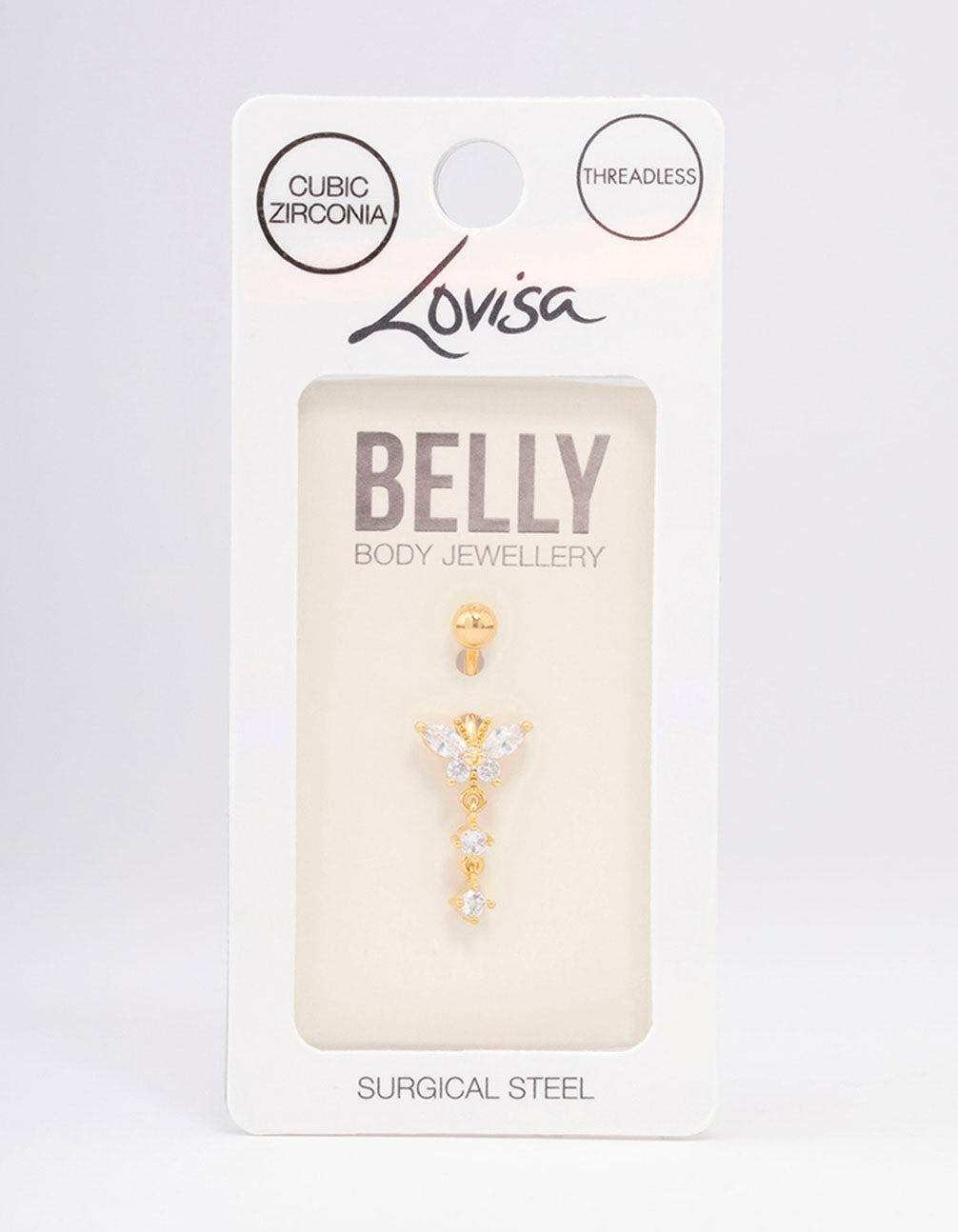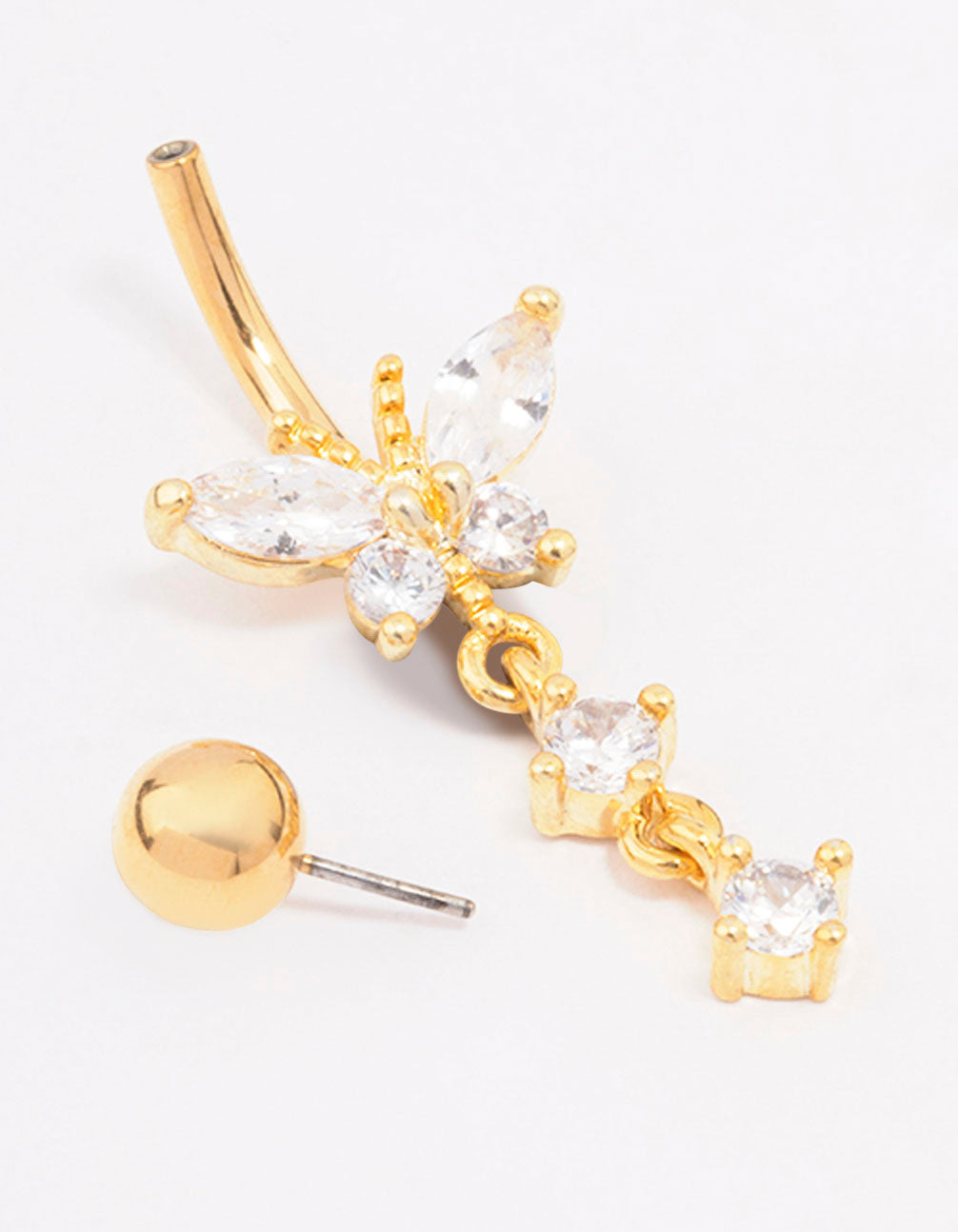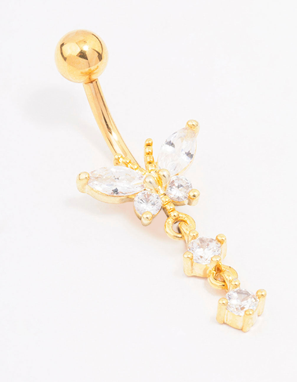 Gold Plated Surgical Steel Cubic Zirconia Butterfly Drop Belly Bar