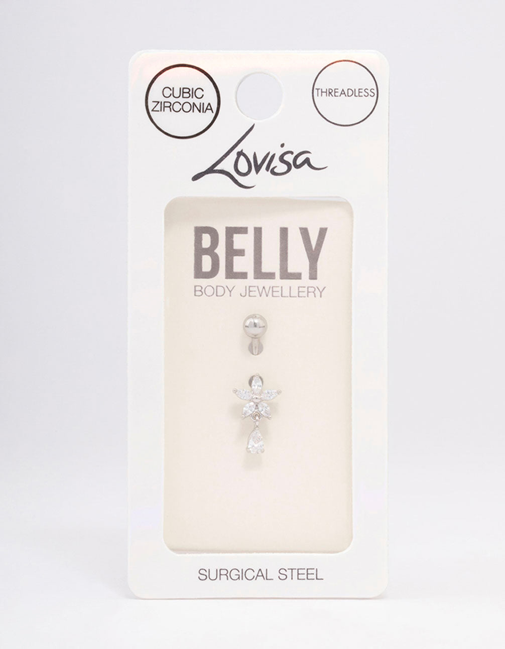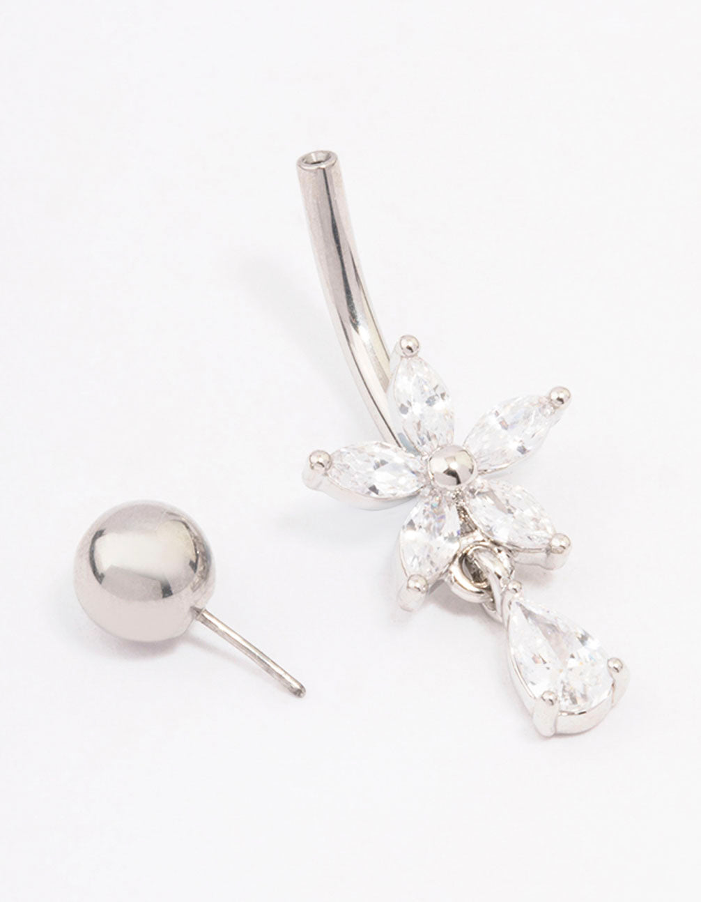 Discover premium piercing jewellery at Lovisa! Our collection of body jewellery is crafted from surgical steel, a durable material that's safe for sensitive skin and long-lasting wear. This belly bar is encrusted with cubic zirconia crystals in a flower formation and a pear shaped cubic zirconia drop, it's also perfect for adding interest to your look. This belly bar features a threadless style, for a secure fit and also makes it easier for stud to be removed.