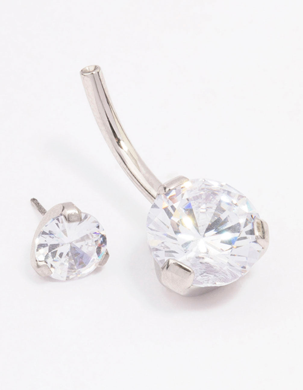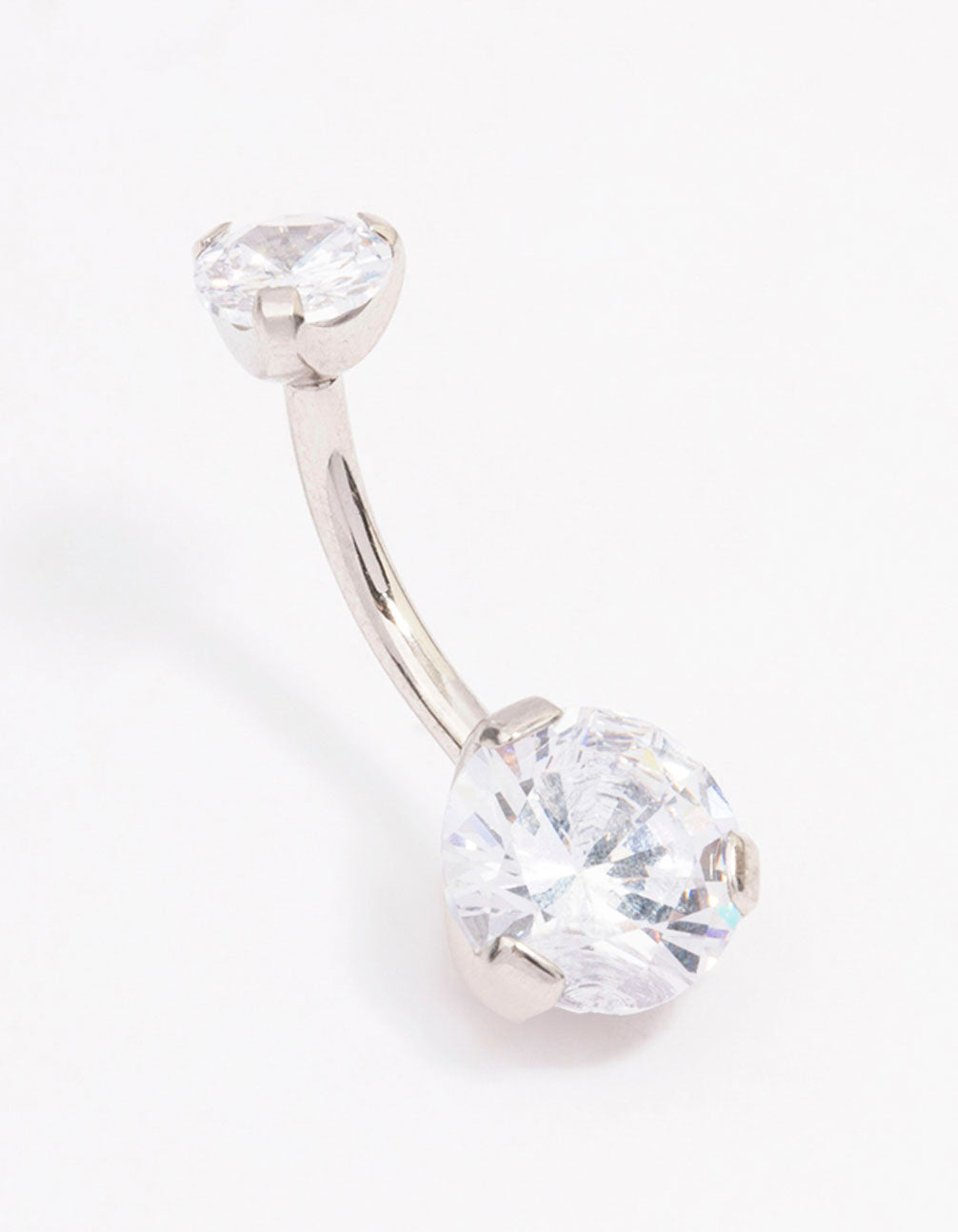 Discover premium piercing jewellery at Lovisa! Our collection of body jewellery is crafted from surgical steel, a durable material that's safe for sensitive skin and long-lasting wear. This belly bar is encrusted with two round cubic zirconia crystals, perfect for adding interest to your look. This belly bar features a threadless style, for a secure fit and also makes it easier for stud to be removed.