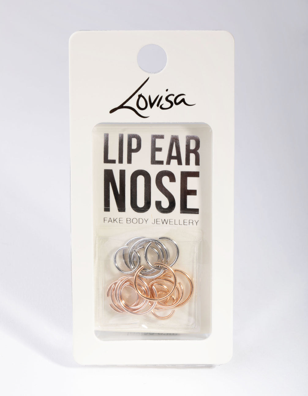 No piercings? No problem! This lip, ear and nose pack includes a range of faux rings in mixed metal tones. Perfect for anyone wanting the look, without the commitment.