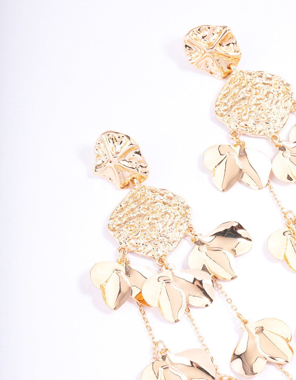 - These statement earrings feature a gorgeous waterfall of gold strands embellished with petals on a molten gold setting.