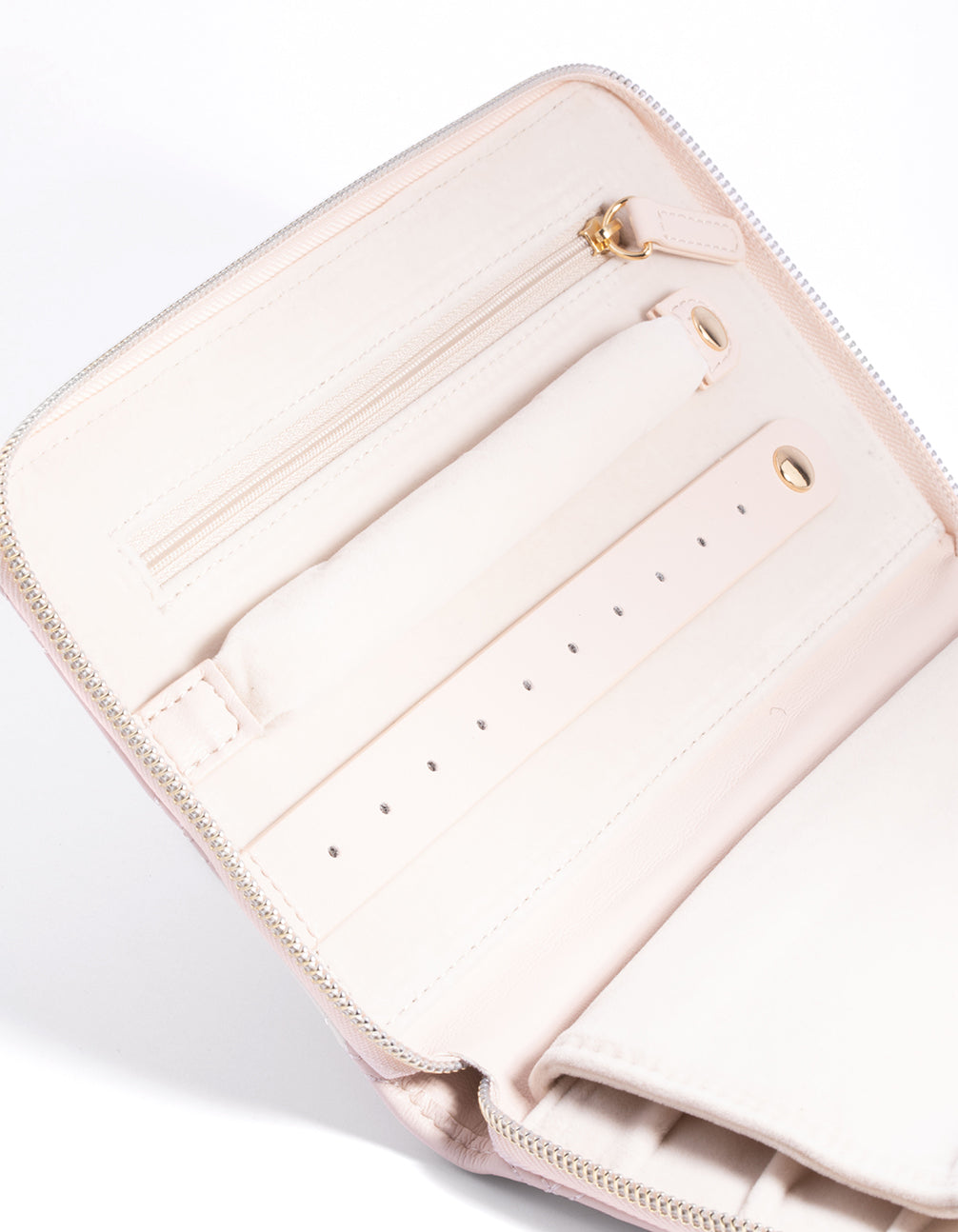 Meet your ultimate travel companion! This compact jewellery case features a textured, faux leather exterior and contains several compartments to store all your jewellery essentials.
