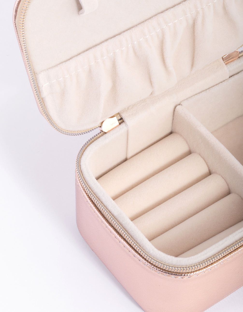 This jewellery box features a compact, rectangular design — perfect for fitting in your handbag, carry on or luggage.