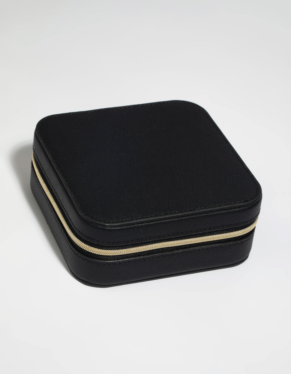 Meet your ultimate travel companion! This compact jewellery box is designed with a durable, black faux leather exterior and features several compartments to store all your jewellery essentials.