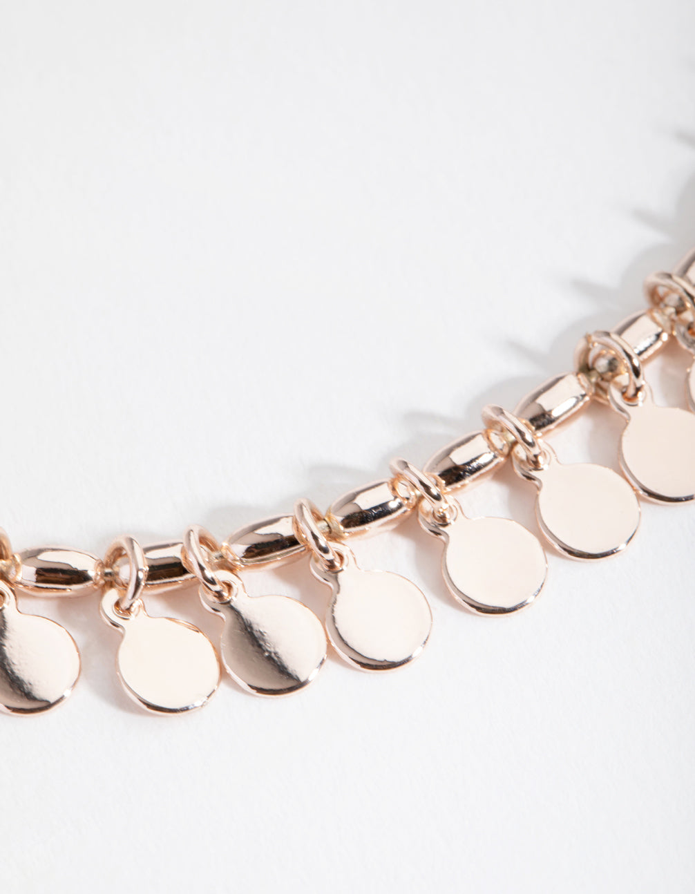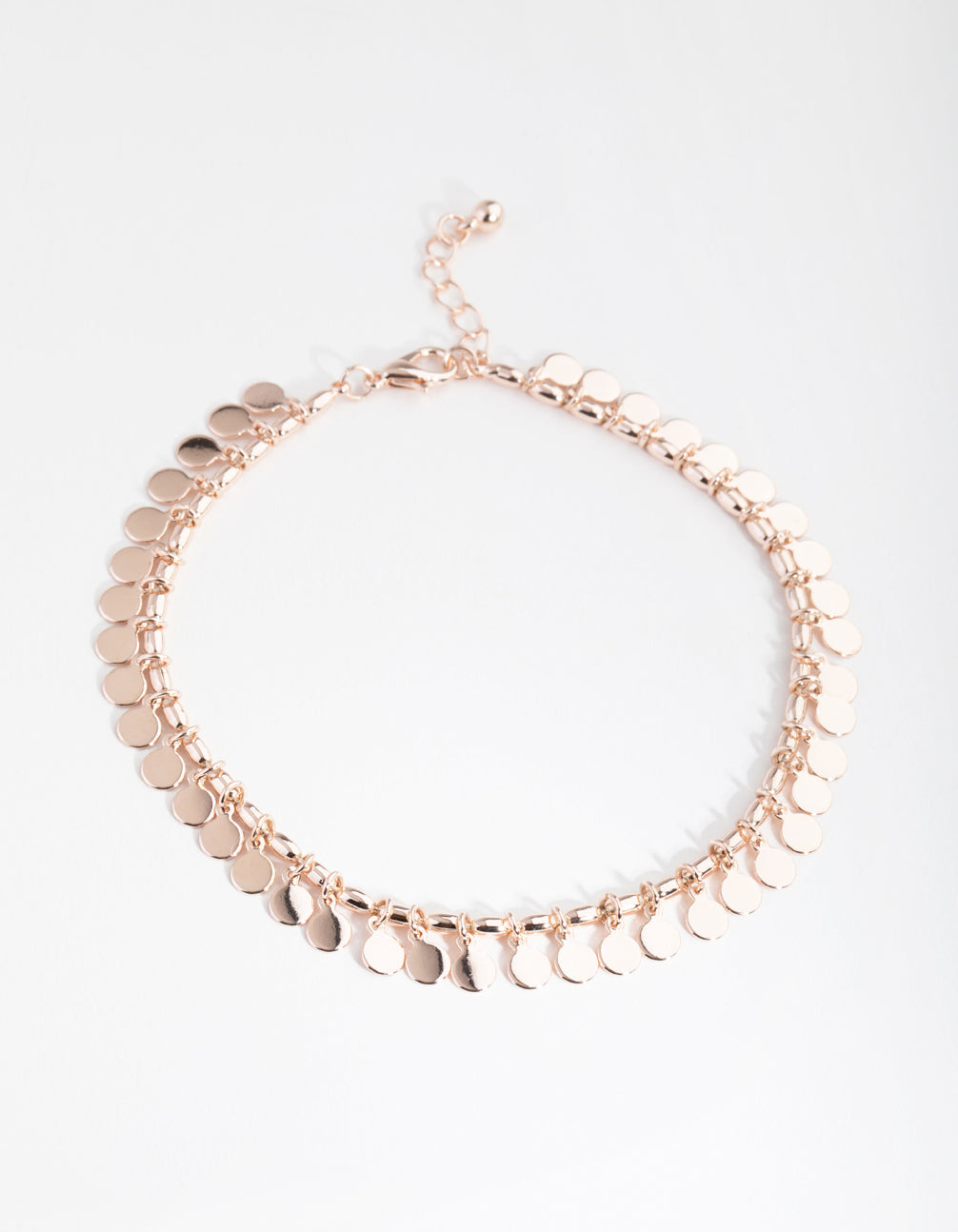 This anklet is perfect for elevating a spring or summer look! It's rose-gold toned and features a dainty, hanging-circle design. Wear them with sandals and painted nails for a holiday-inspired look.
