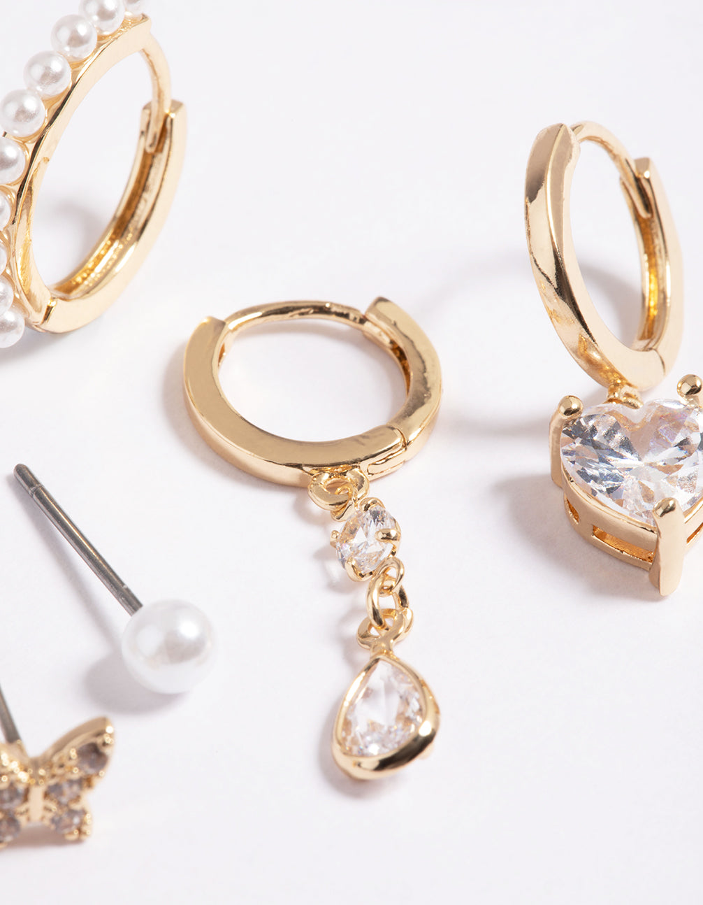 Gold Cubic Zirconia & Pearl Butterfly 6-Pack Earrings