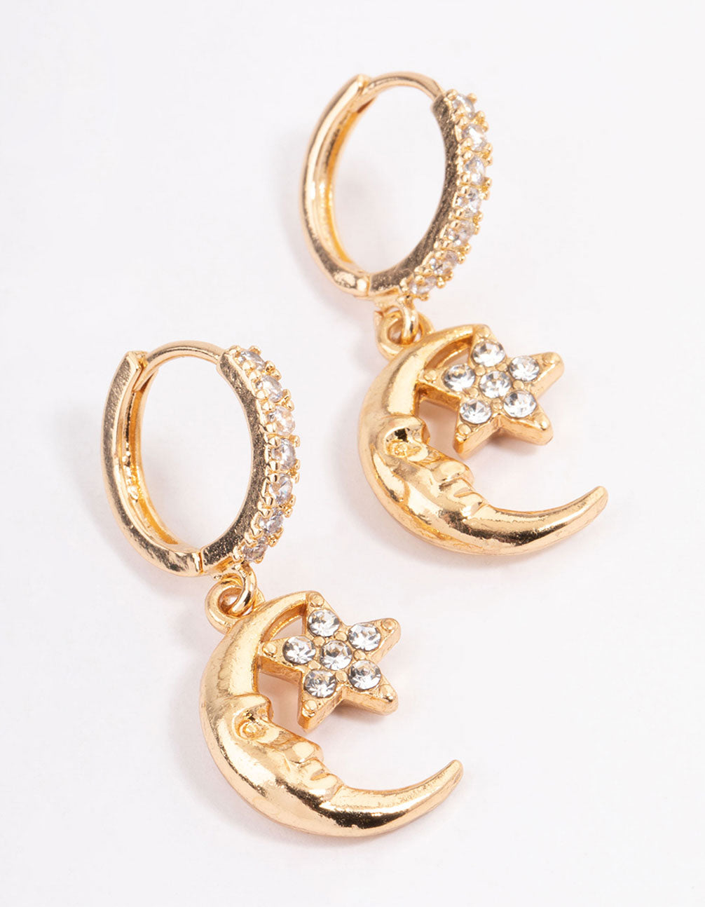 Create the ultimate ear stack with our range of versatile and on-trend earrings from our Curated Collection! These gold-toned huggie earrings are designed with moon and star motifs for a celestial look.