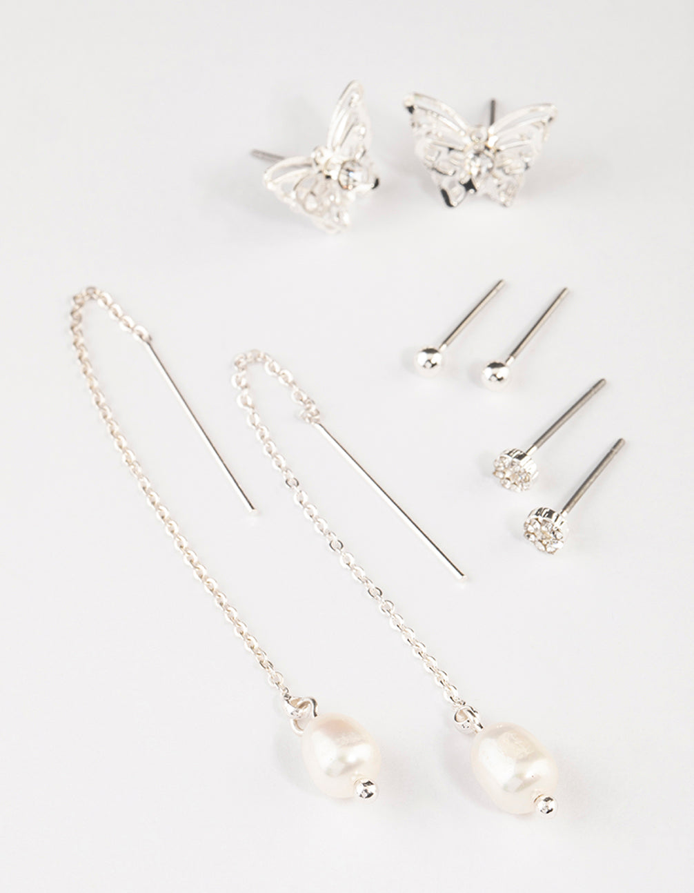 - This silver-toned earring pack contains four sets of earrings, including a threader stud with a beautiful butterfly motif for added detail.