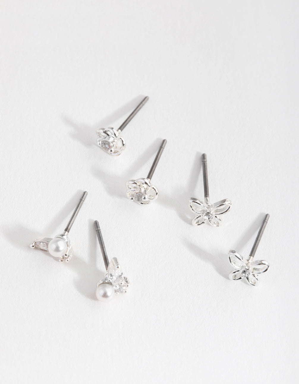 Lovisa loves a curated ear! This pack is silver toned, and includes three pairs of dainty little studs that are perfect for jazzing up your ear stack! Designs include delicate flowers and faux pearls. So pretty!