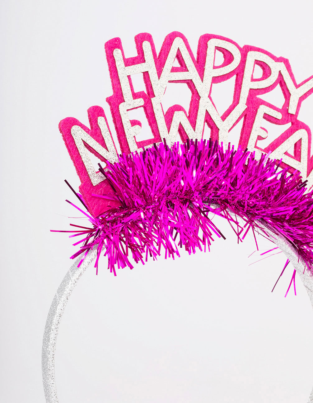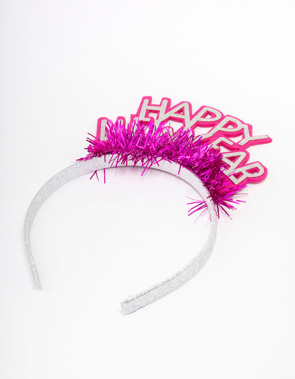 - This celebratory headband features the phrase 'Happy New Year' in bold pink and silver letters, adorned with pink confetti for an eye-catching finish to your NYE hairstyle.