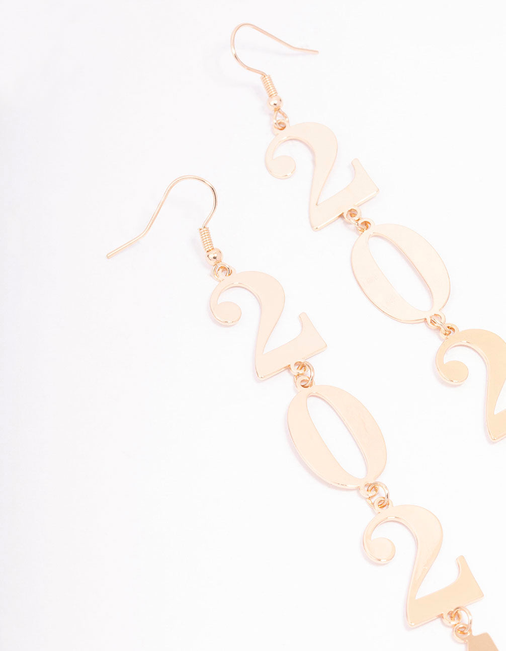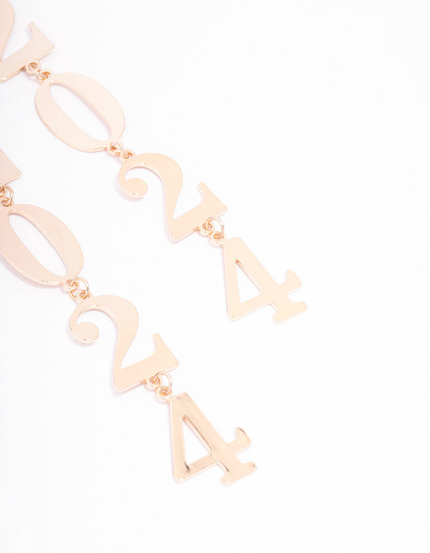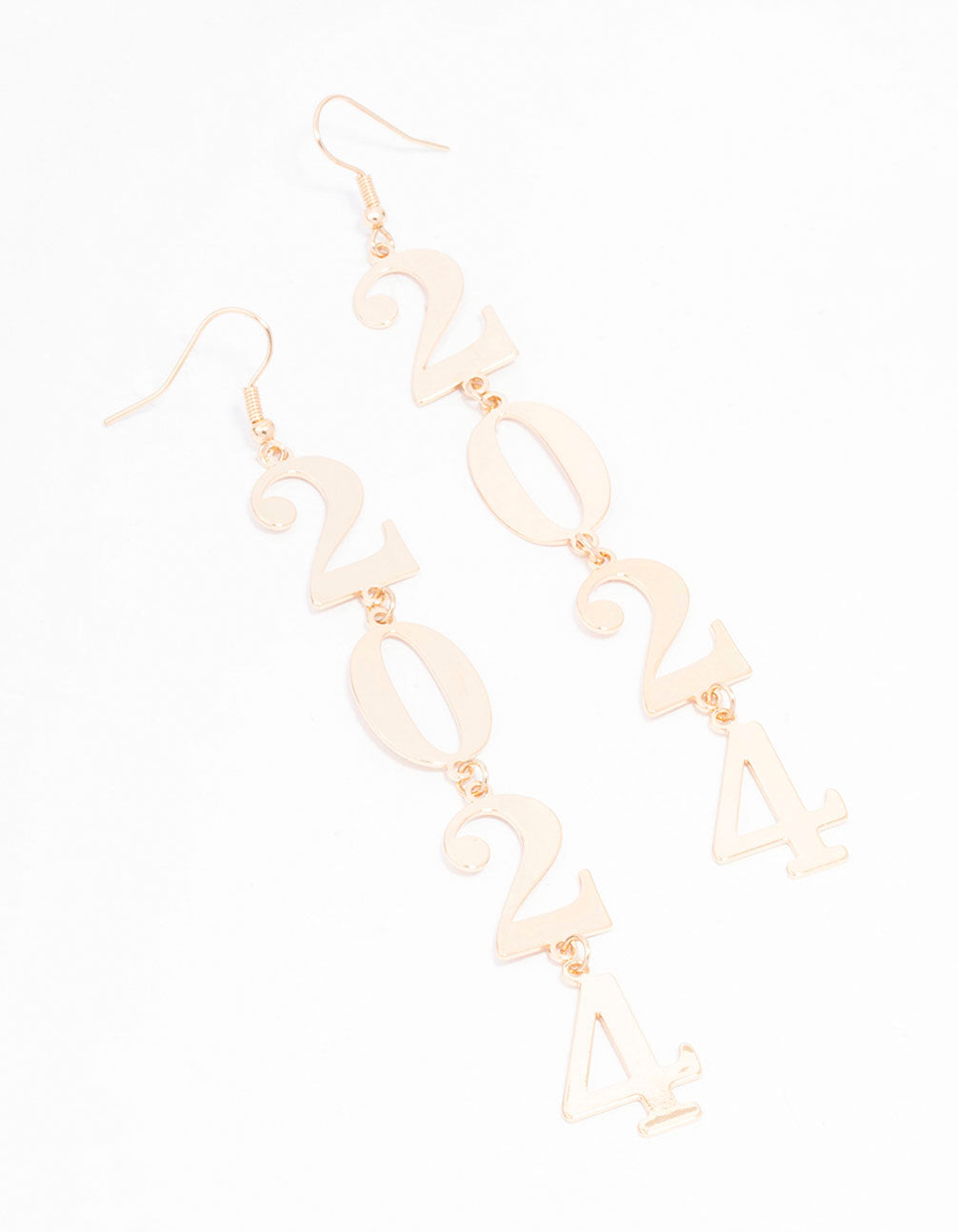 These celebratory drop earrings feature the year 2024 in a gold, metallic finish, perfect for adding interest to your NYE outfit!